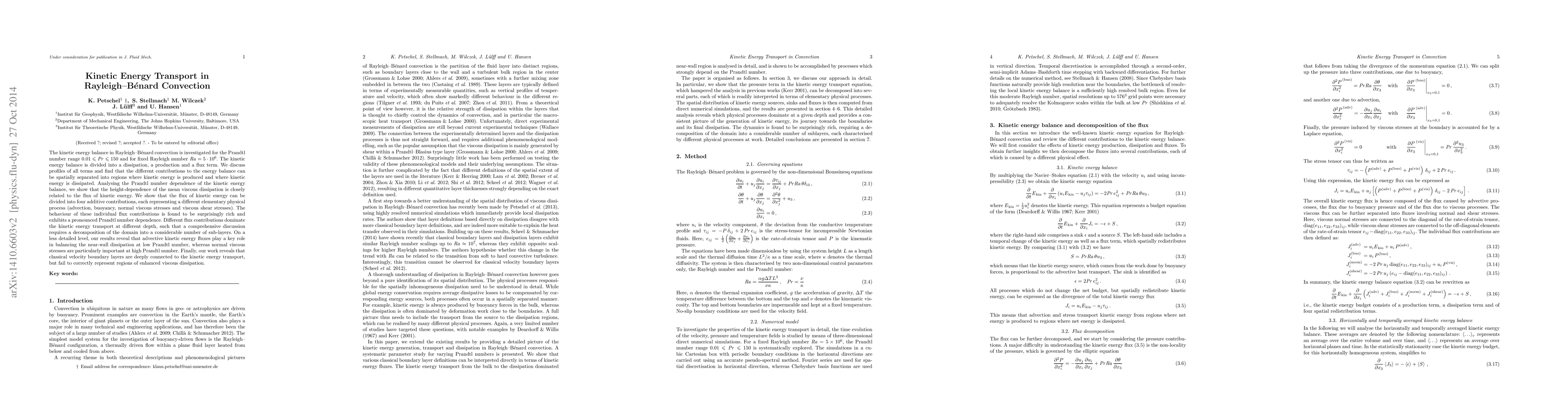This paper investigates the kinetic energy transport in Rayleigh-Bénard convection across a wide range of Prandtl numbers, revealing spatially separated regions of kinetic energy production and dissipation. The study identifies four distinct kinetic energy flux contributions, each linked to different physical processes, with significant Prandtl number dependence.