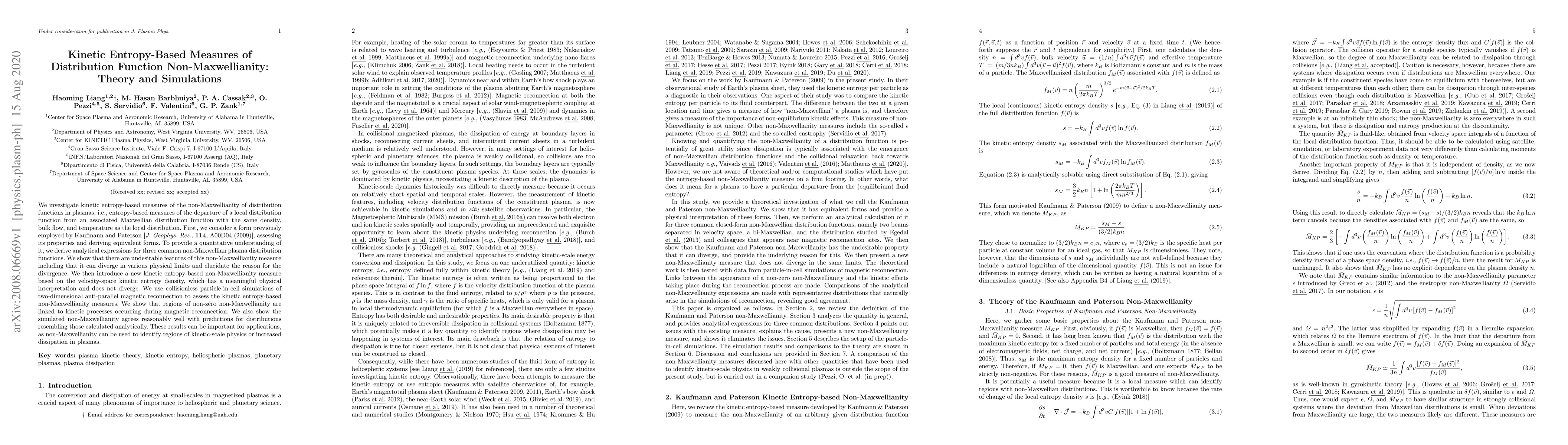 This paper explores kinetic entropy-based measures for assessing non-Maxwellianity in plasma distribution functions, identifying issues with existing measures, and introducing a new entropy-based measure that avoids divergence. Simulations of magnetic reconnection show that non-Maxwellian regions correlate with kinetic processes.