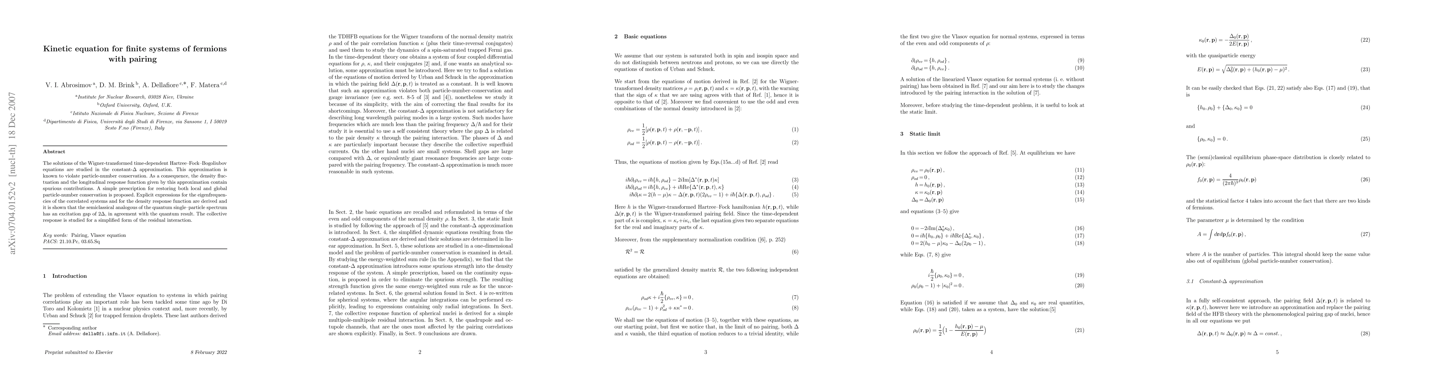 The solutions of the Wigner-transformed time-dependent Hartree--Fock--Bogoliubov equations are studied in the constant-$\Delta$ approximation. This approximation is known to violate particle-number conservation. As a consequence, the density fluctuation and the longitudinal response function given by this approximation contain spurious contributions. A simple prescription for restoring both local and global particle-number conservation is proposed. Explicit expressions for the eigenfrequencies of the correlated systems and for the density response function are derived and it is shown that the semiclassical analogous of the quantum single--particle spectrum has an excitation gap of $2\Delta$, in agreement with the quantum result. The collective response is studied for a simplified form of the residual interaction.
