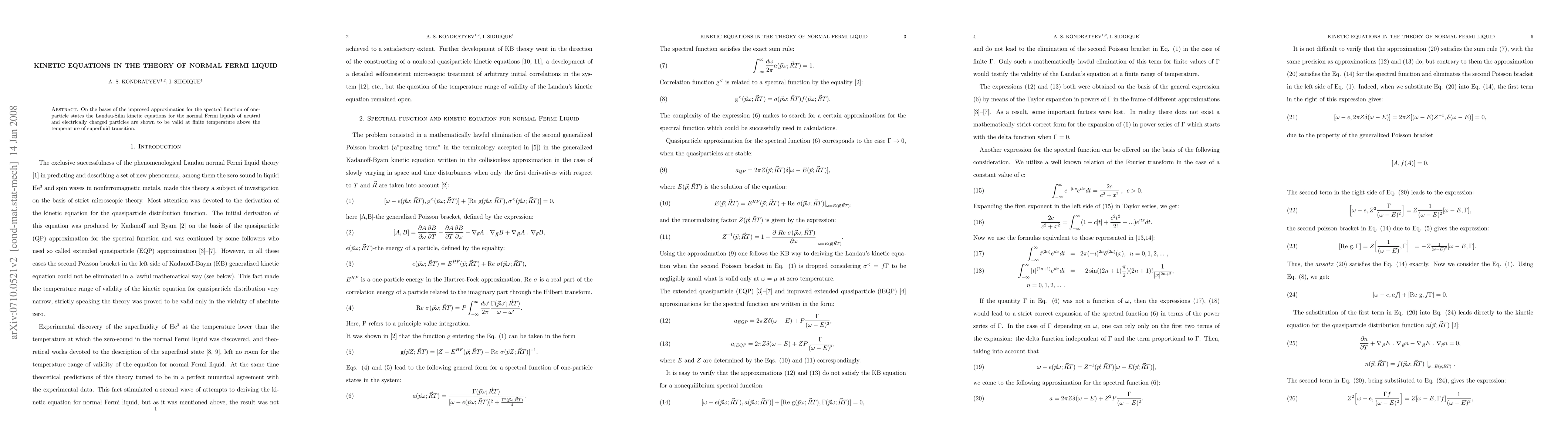 On the bases of the improved approximation for the spectral function of one-particle states the Landau-Silin kinetic equations for the normal Fermi liquids of neutral and electrically charged particles are shown to be valid at finite temperature above the temperature of superfluid transition.