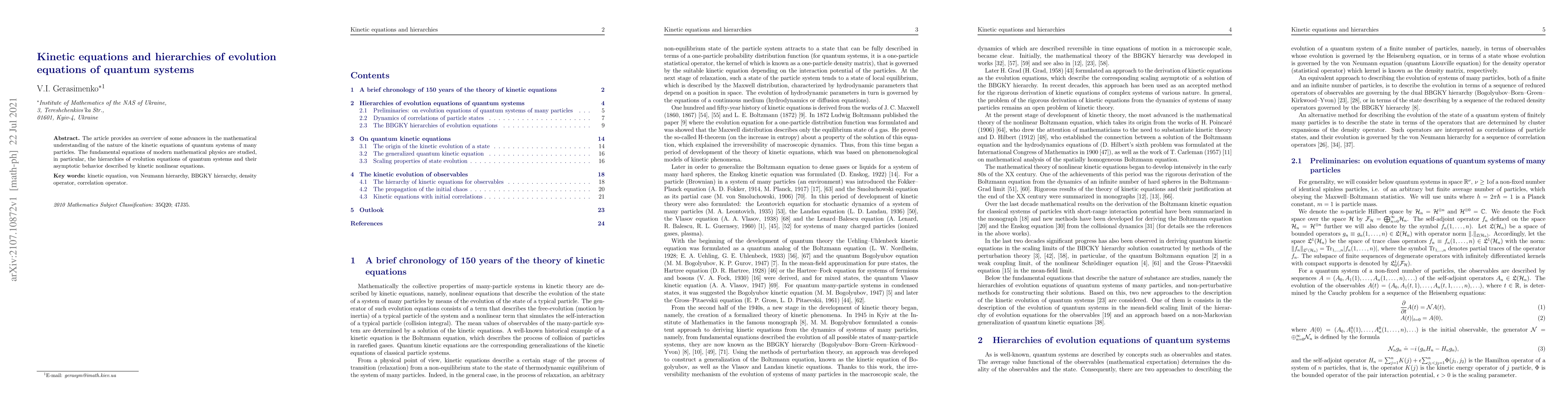 Summary: This paper reviews recent mathematical advancements in understanding kinetic equations for quantum many-particle systems, focusing on hierarchies of evolution equations and their asymptotic behavior described by nonlinear kinetic equations.