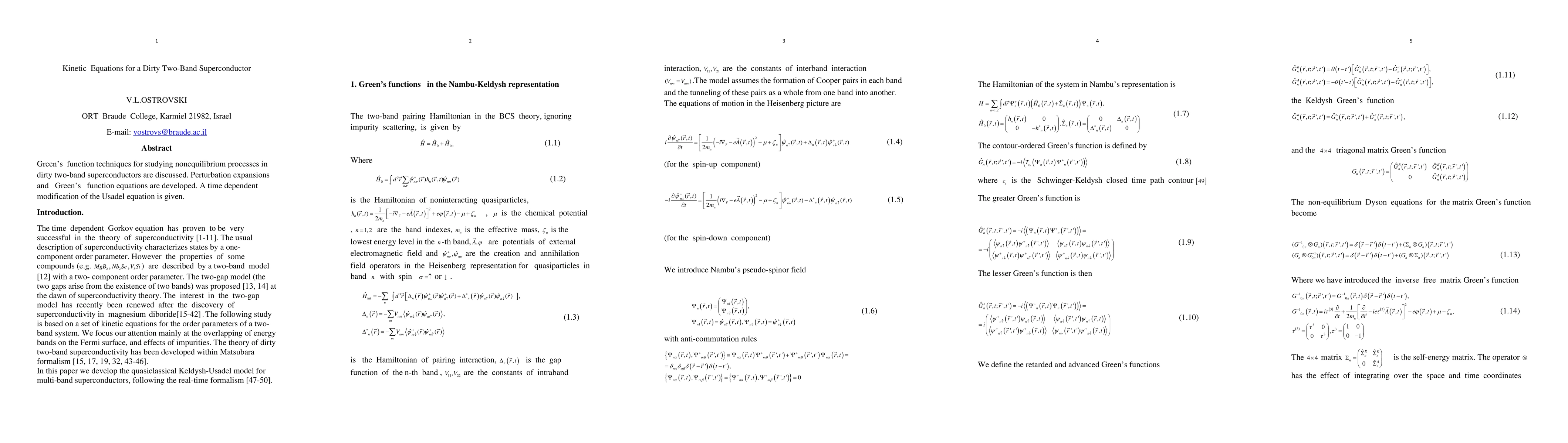 Green function techniques for studying nonequilibrium processes in dirty two-band superconductors are discussed. Perturbation expansions and Green function equations are developed. A time dependent modification of the Usadel equation is given.