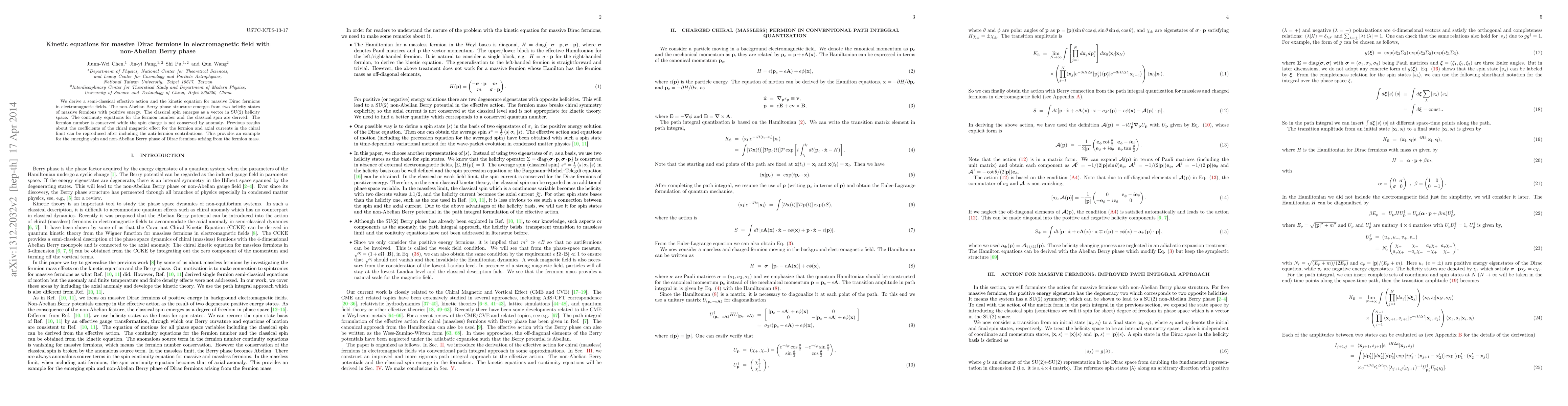 This paper derives kinetic equations for massive Dirac fermions in electromagnetic fields, highlighting the emergence of a non-Abelian Berry phase and classical spin in SU(2) helicity space. It also shows that while fermion number is conserved, spin charge is not due to anomaly, and extends previous results on the chiral magnetic effect by including anti-fermion contributions.