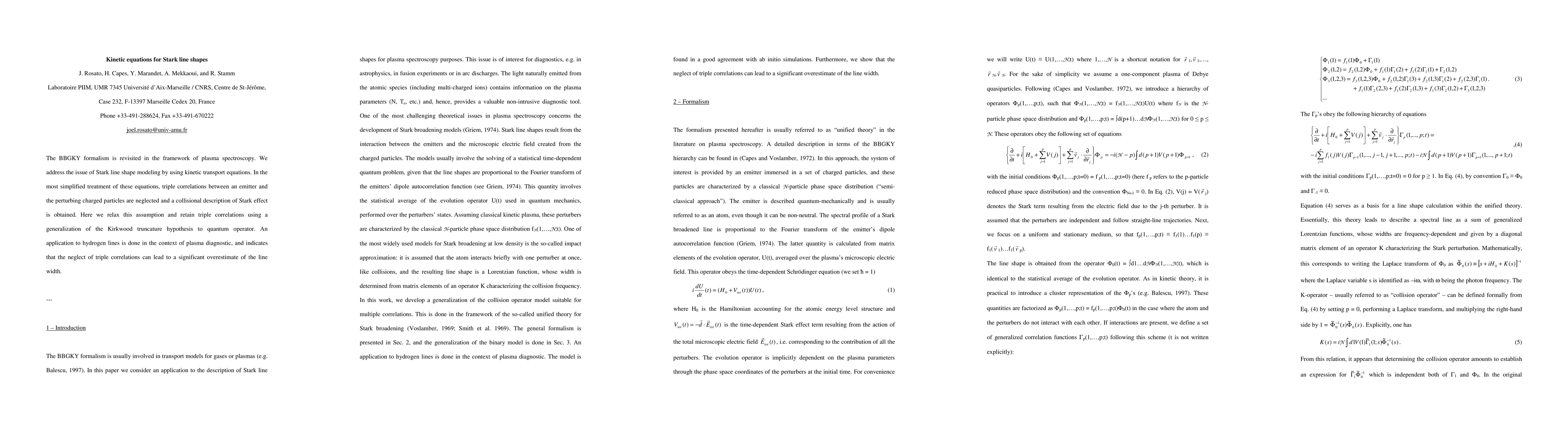 The BBGKY formalism is revisited in the framework of plasma spectroscopy. We address the issue of Stark line shape modeling by using kinetic transport equations. In the most simplified treatment of these equations, triple correlations between an emitter and the perturbing charged particles are neglected and a collisional description of Stark effect is obtained. Here we relax this assumption and retain triple correlations using a generalization of the Kirkwood truncature hypothesis to quantum operator. An application to hydrogen lines is done in the context of plasma diagnostic, and indicates that the neglect of triple correlations can lead to a significant overestimate of the line width.