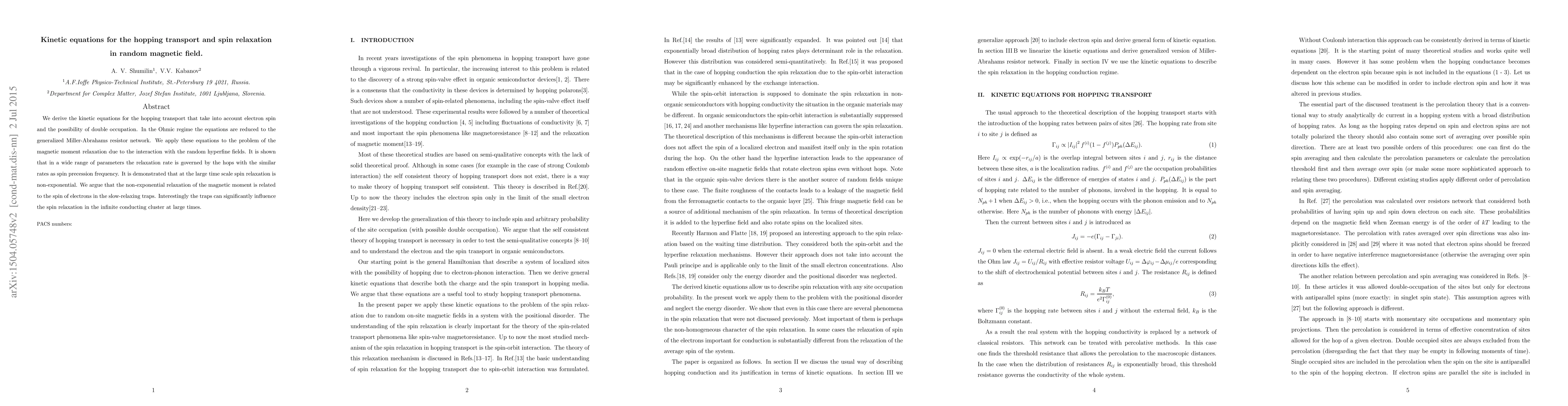 This research paper derives kinetic equations for hopping transport and spin relaxation in a random magnetic field, showing that relaxation rates often match spin precession frequencies and can lead to non-exponential relaxation times at large scales.