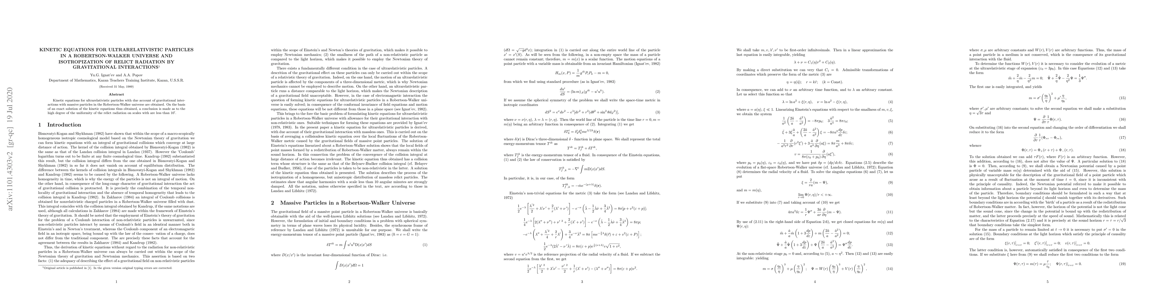 This paper derives kinetic equations for ultrarelativistic particles considering gravitational interactions in a Robertson-Walker universe, and concludes that these interactions lead to a high degree of uniformity in the relict radiation on small scales.