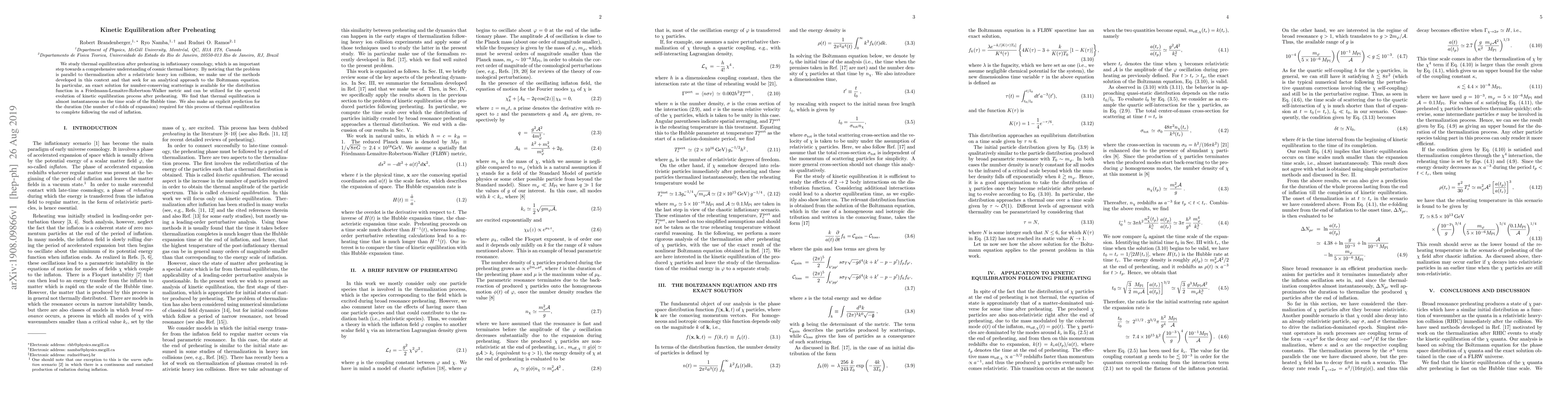 This paper investigates the thermal equilibration process following preheating in inflationary cosmology, drawing parallels to thermalization in relativistic heavy ion collisions. It utilizes an exact analytical solution for the Boltzmann equation to predict that thermal equilibration occurs almost instantaneously on the Hubble time scale, with a specific prediction for the number of e-folds needed for completion.