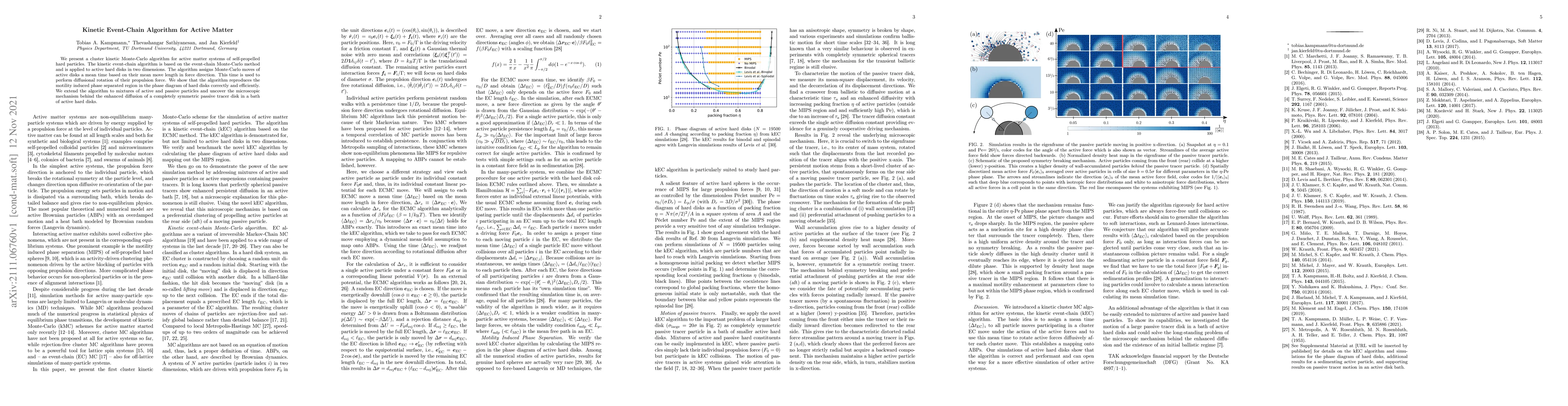 This paper introduces a kinetic event-chain Monte-Carlo algorithm for simulating active matter systems, specifically self-propelled hard particles. The algorithm effectively reproduces phase separation and enhances understanding of diffusion in mixtures of active and passive particles.