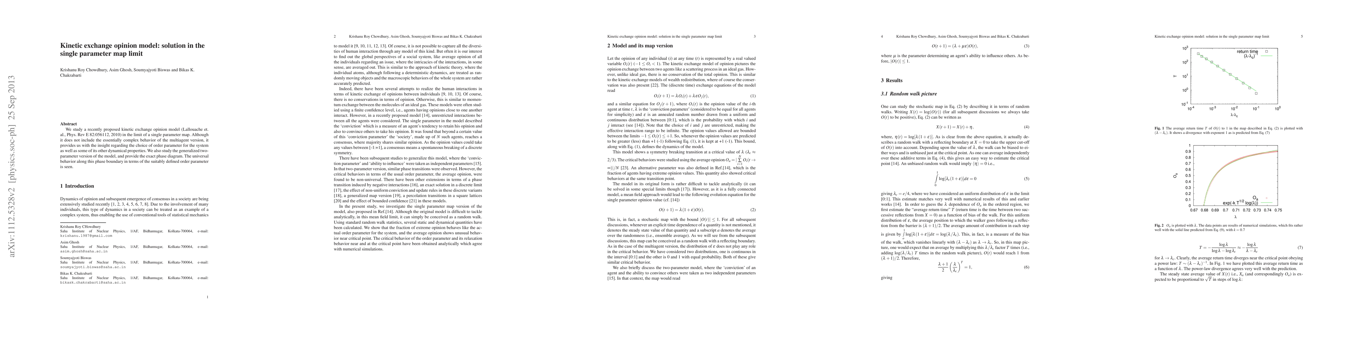 We study a recently proposed kinetic exchange opinion model (Lallouache et. al., Phys. Rev E 82:056112, 2010) in the limit of a single parameter map. Although it does not include the essentially complex behavior of the multiagent version, it provides us with the insight regarding the choice of order parameter for the system as well as some of its other dynamical properties. We also study the generalized two- parameter version of the model, and provide the exact phase diagram. The universal behavior along this phase boundary in terms of the suitably defined order parameter is seen.