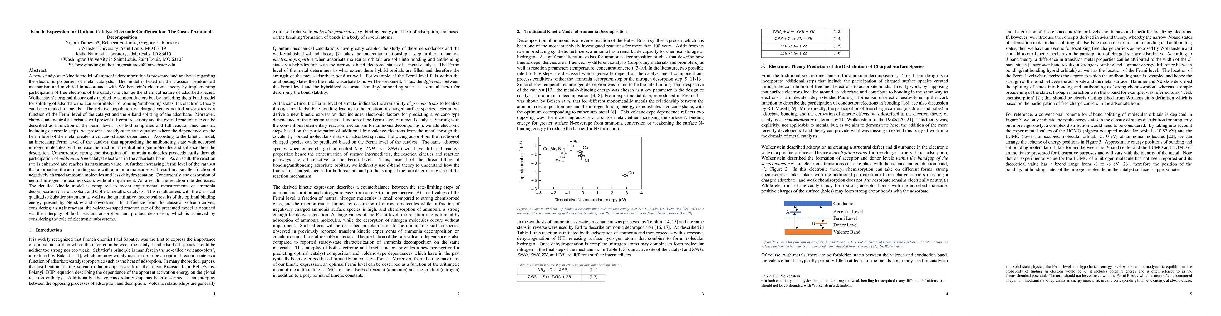This paper presents a steady-state kinetic model for ammonia decomposition on metal catalysts, incorporating electronic properties based on the Wolkenstein theory and the d-band model. The model predicts a volcano-shaped rate dependence on the catalyst's Fermi level, optimizing the reaction rate when the Fermi level approaches the antibonding state with adsorbed nitrogen.