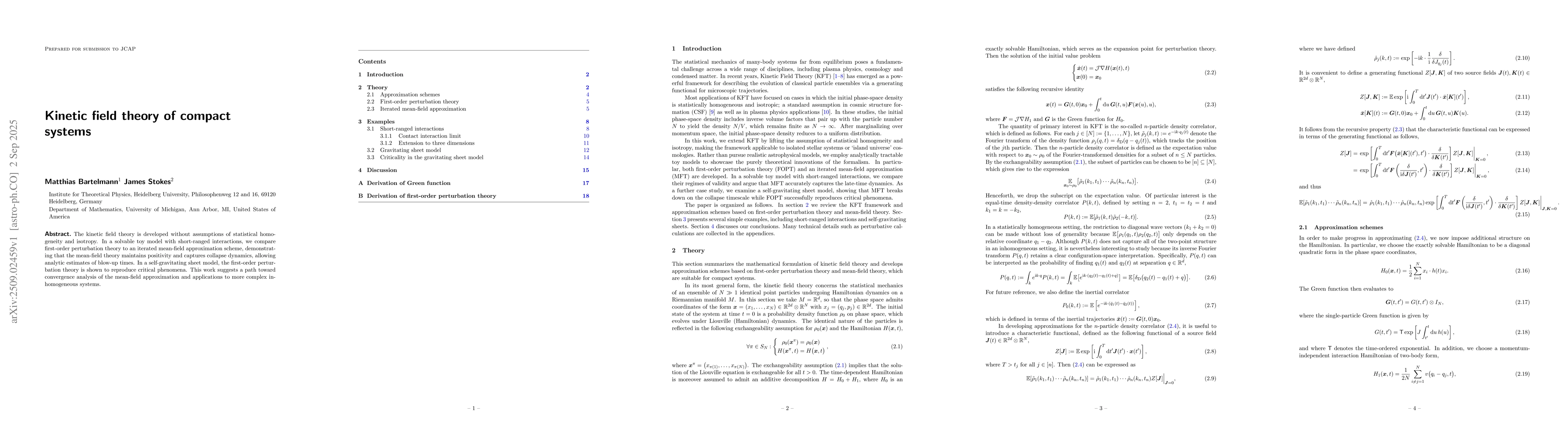 The kinetic field theory is developed without assumptions of statistical homogeneity and isotropy. In a solvable toy model with short-ranged interactions, we compare first-order perturbation theory to an iterated mean-field approximation scheme, demonstrating that the mean-field theory maintains positivity and captures collapse dynamics, allowing analytic estimates of blow-up times. In a self-gravitating sheet model, the first-order perturbation theory is shown to reproduce critical phenomena. This work suggests a path toward convergence analysis of the mean-field approximation and applications to more complex inhomogeneous systems.