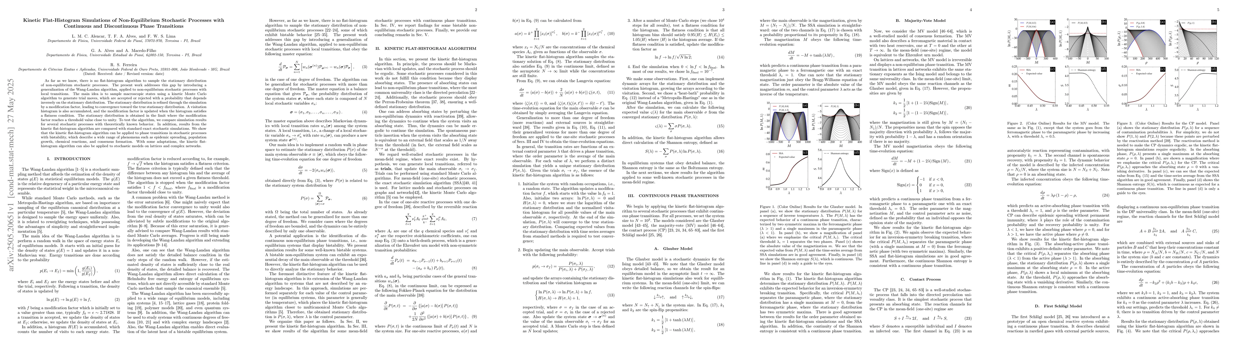 As far as we know, there is no flat-histogram algorithm to sample the stationary distribution of non-equilibrium stochastic processes. The present work addresses this gap by introducing a generalization of the Wang-Landau algorithm, applied to non-equilibrium stochastic processes with local transitions. The main idea is to sample macroscopic states using a kinetic Monte Carlo algorithm to generate trial moves, which are accepted or rejected with a probability that depends inversely on the stationary distribution. The stationary distribution is refined through the simulation by a modification factor, leading to convergence toward the true stationary distribution. A visitation histogram is also accumulated, and the modification factor is updated when the histogram satisfies a flatness condition. The stationary distribution is obtained in the limit where the modification factor reaches a threshold value close to unity. To test the algorithm, we compare simulation results for several stochastic processes with theoretically known behavior. In addition, results from the kinetic flat-histogram algorithm are compared with standard exact stochastic simulations. We show that the kinetic flat-histogram algorithm can be applied to phase transitions in stochastic processes with bistability, which describe a wide range of phenomena such as epidemic spreading, population growth, chemical reactions, and consensus formation. With some adaptations, the kinetic flat-histogram algorithm can also be applied to stochastic models on lattices and complex networks.