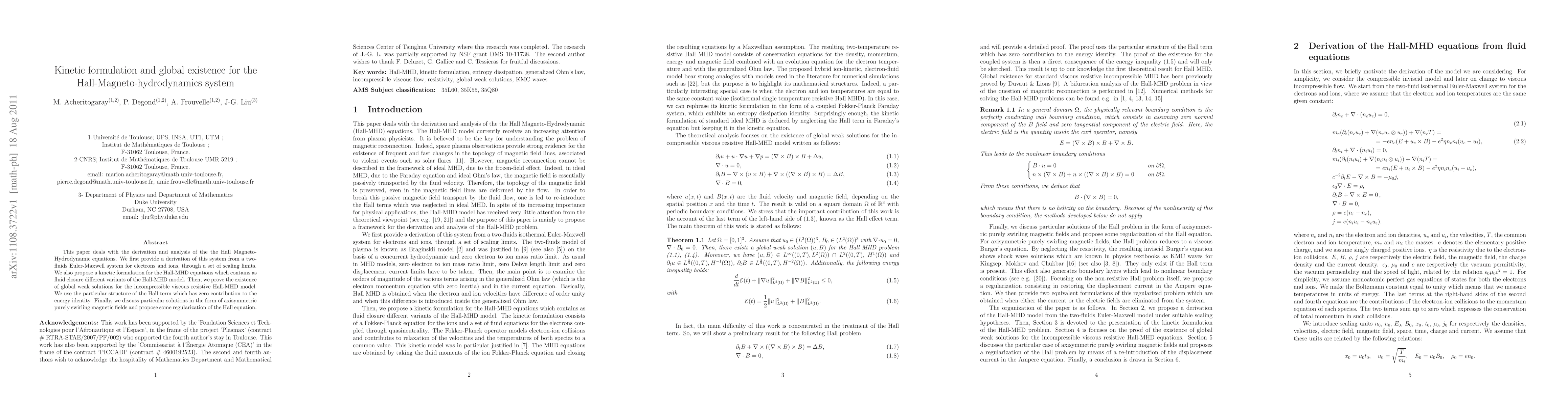 This paper derives the Hall Magneto-Hydrodynamics (MHD) equations from a two-fluid Euler-Maxwell system and proposes a kinetic formulation. It proves the existence of global weak solutions for the incompressible viscous resistive Hall-MHD model, leveraging the unique structure of the Hall term.