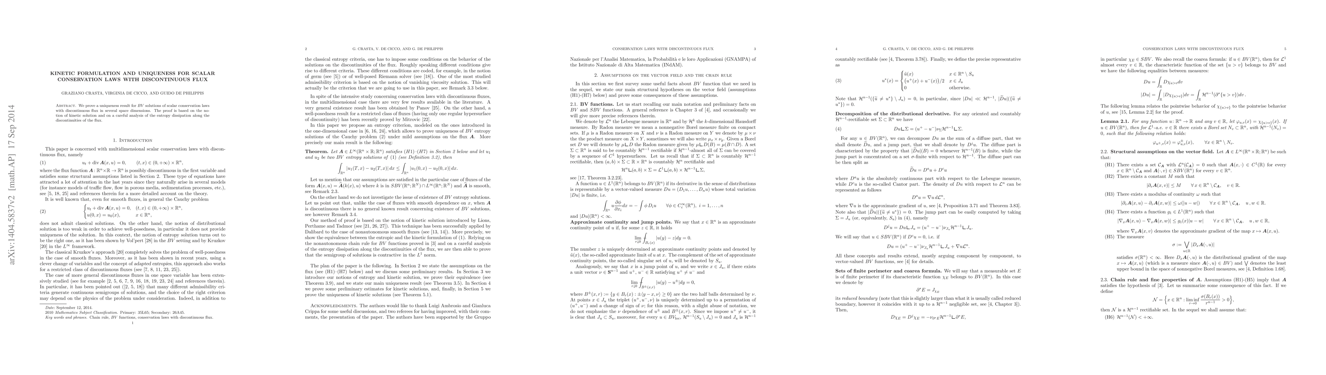 Summary: This paper establishes uniqueness for BV solutions of scalar conservation laws with discontinuous flux using kinetic solutions and entropy dissipation analysis along flux discontinuities. The method applies to multiple spatial dimensions.
