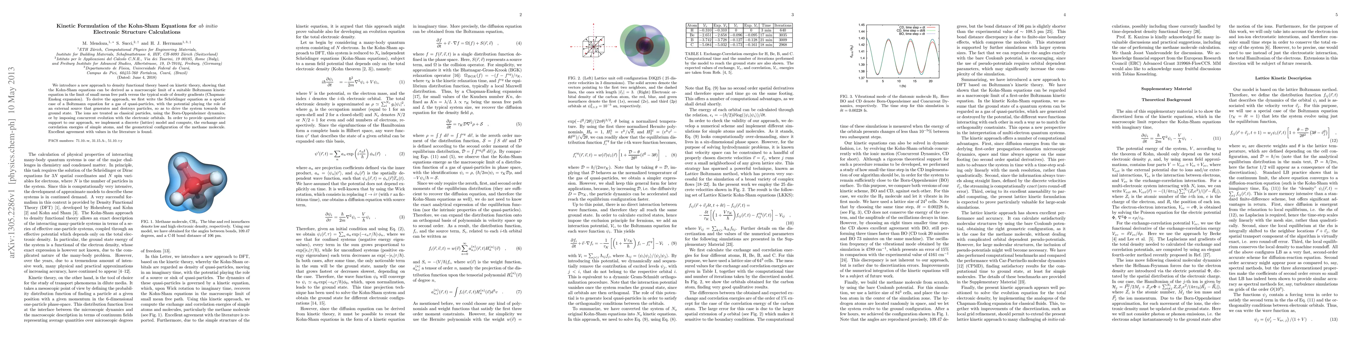 We introduce a new approach to density functional theory based on kinetic theory, showing that the Kohn-Sham equations can be derived as a macroscopic limit of a suitable Boltzmann kinetic equation in the limit of small mean free path versus the typical scale of density gradients (Chapman-Enskog expansion). To derive the approach, we first write the Schr\"odinger equation as a special case of a Boltzmann equation for a gas of quasi-particles, with the potential playing the role of an external source that generates and destroys particles, so as to drive the system towards the ground state. The ions are treated as classical particles, using the Born-Oppenheimer dynamics, or by imposing concurrent evolution with the electronic orbitals. In order to provide quantitative support to our approach, we implement a discrete (lattice) model and compute, the exchange and correlation energies of simple atoms, and the geometrical configuration of the methane molecule. Excellent agreement with values in the literature is found.