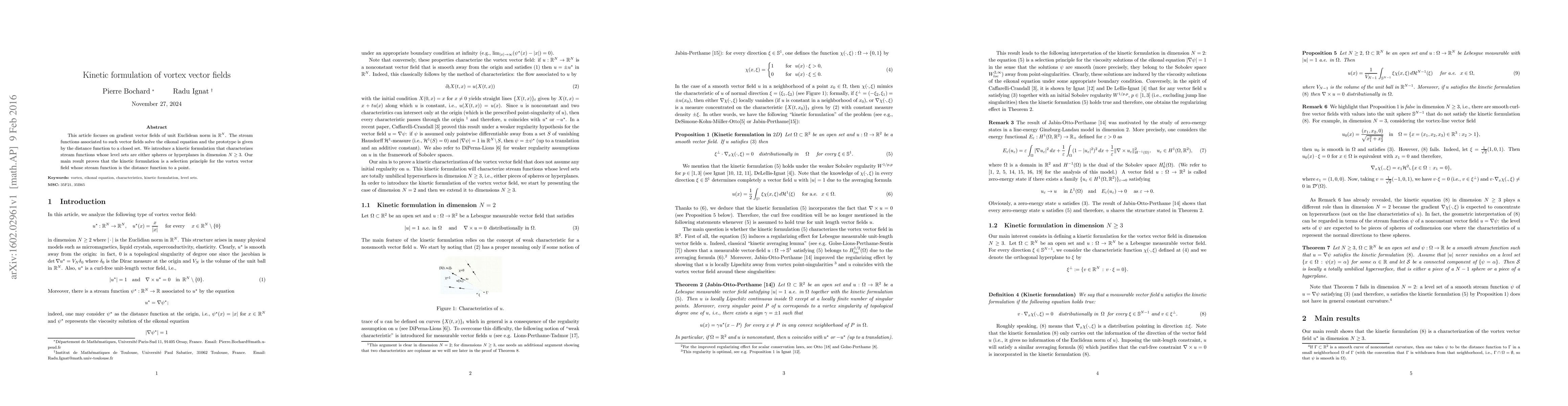 Researchers developed a kinetic formulation for vortex vector fields in dimension N >= 3, which is a selection principle for stream functions that represent distance to a point or hyperplane.