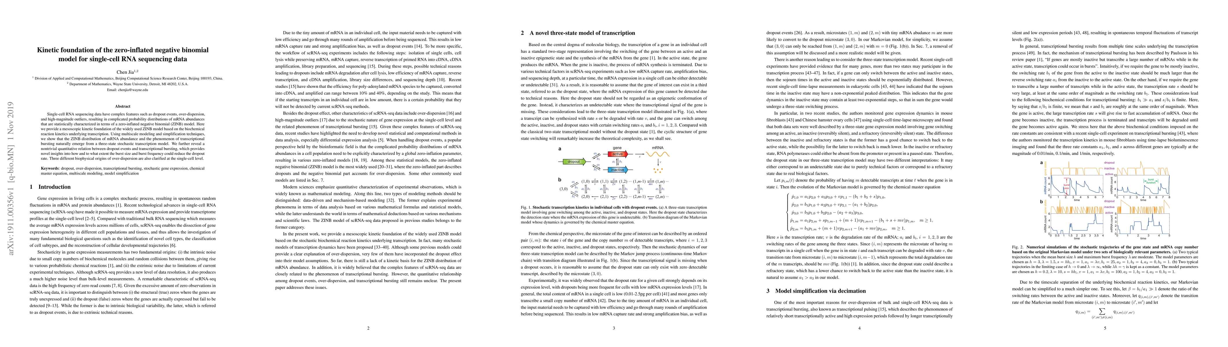 This paper establishes a kinetic foundation for the zero-inflated negative binomial model used in single-cell RNA sequencing, demonstrating that it emerges from a three-state stochastic transcription model. It also reveals a quantitative link between dropout events and transcriptional bursting, offering insights into reducing dropout rates and clarifying three biophysical origins of over-dispersion.