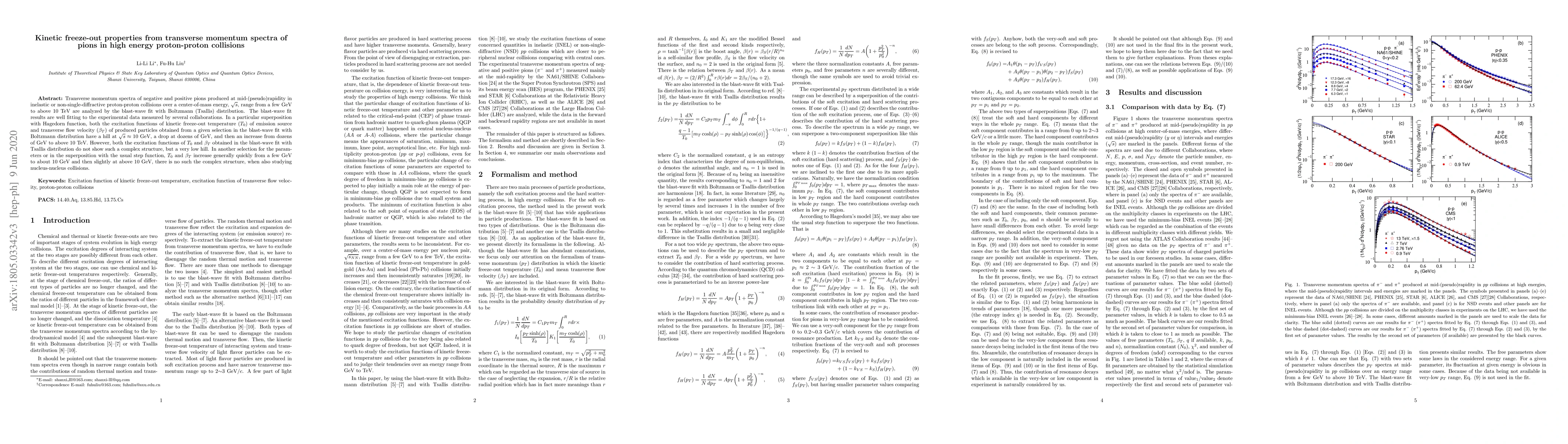 This paper analyzes transverse momentum spectra of pions in high-energy proton-proton collisions using blast-wave fits with Boltzmann and Tsallis distributions, revealing distinct kinetic freeze-out properties. The results show a complex structure in the excitation functions for temperature and flow velocity at specific energy ranges, but simpler trends in other selections.