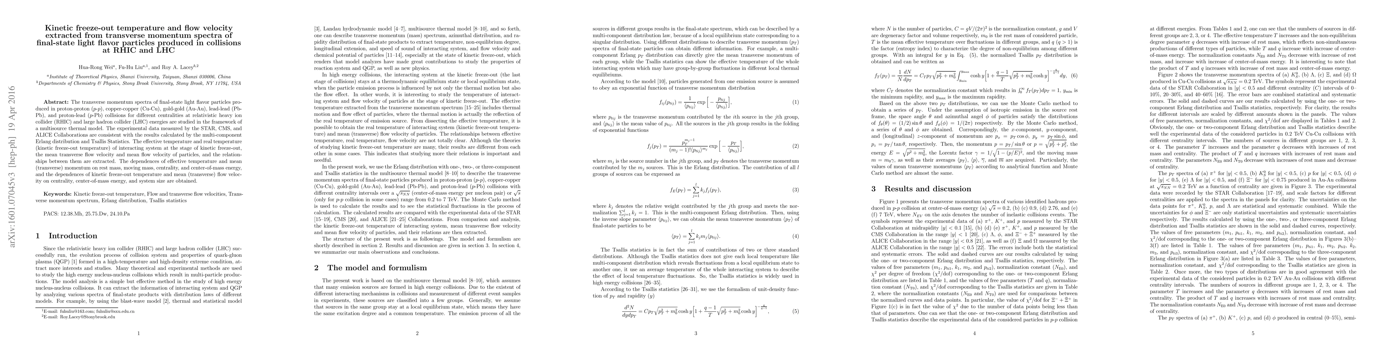 This paper analyzes transverse momentum spectra of light flavor particles from various heavy-ion collisions at RHIC and LHC, using a multisource thermal model. It extracts kinetic freeze-out temperature and flow velocity, revealing relationships and dependencies on centrality, energy, and system size.