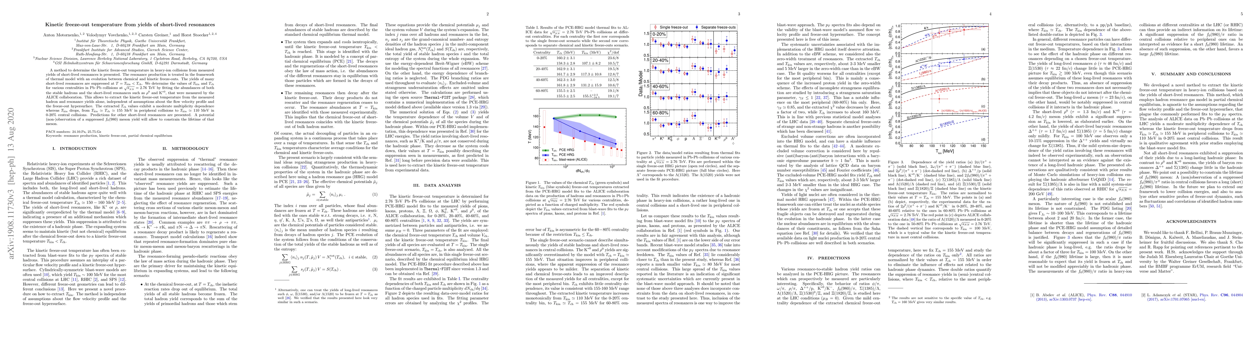 Researchers developed a method to determine kinetic freeze-out temperature in heavy-ion collisions from measured yields of short-lived resonances, extracting temperatures for various centralities in Pb--Pb collisions at 2.76 TeV.