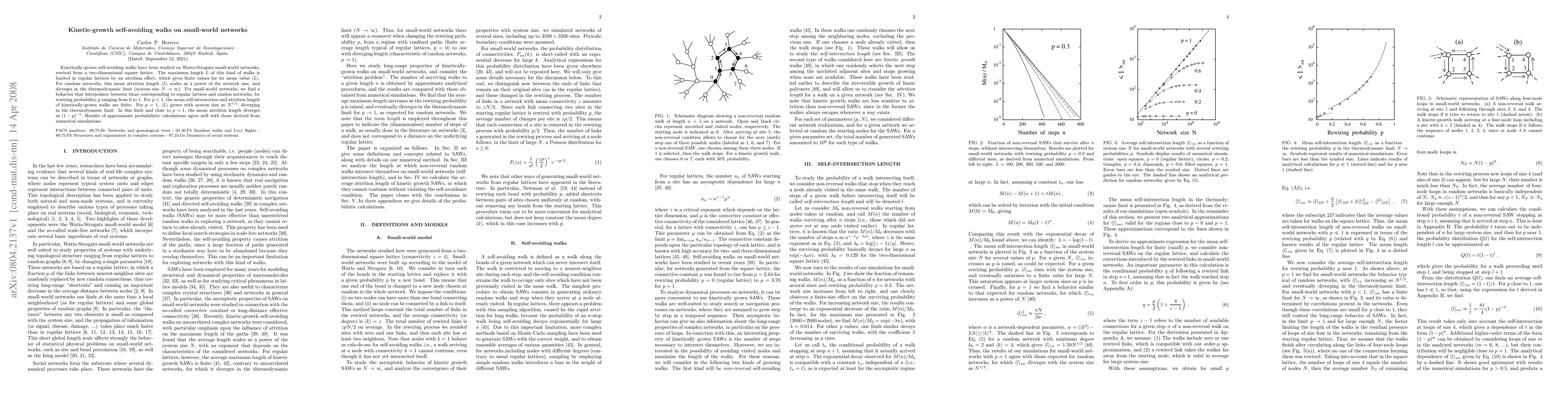This paper investigates kinetic-growth self-avoiding walks on Watts-Strogatz small-world networks, finding that the mean walk length < L > interpolates between regular lattices and random networks depending on rewiring probability p. For p < 1, < L > is finite, while for p = 1, it scales as N^{1/2} and diverges in the thermodynamic limit.