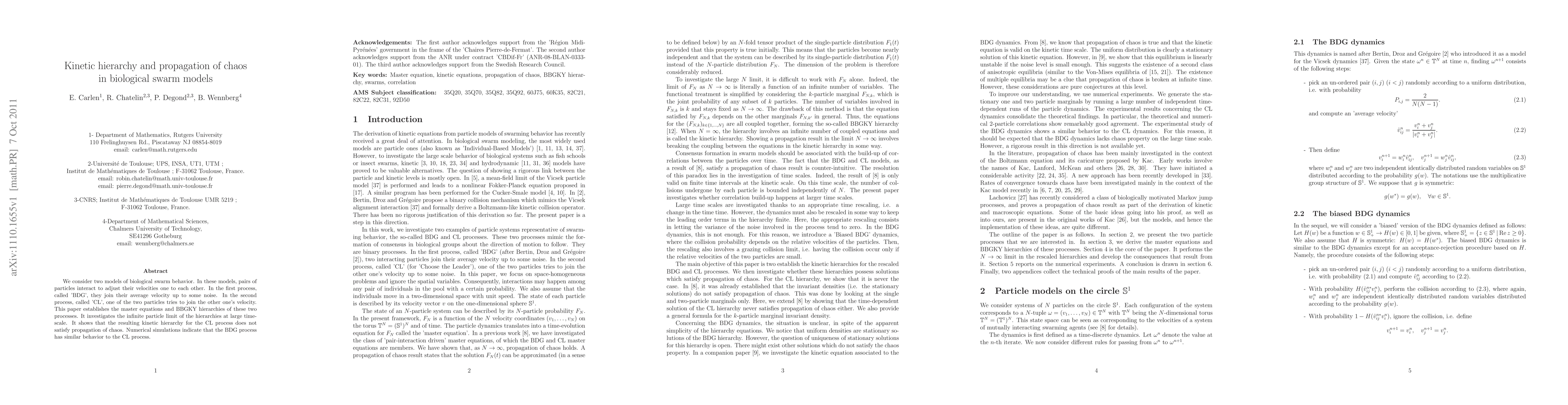 This paper examines two biological swarm models, BDG and CL, where particles adjust their velocities based on interactions. It establishes kinetic hierarchies and investigates the infinite particle limit, finding that the CL process does not exhibit propagation of chaos, while numerical simulations suggest similar behavior for the BDG process.