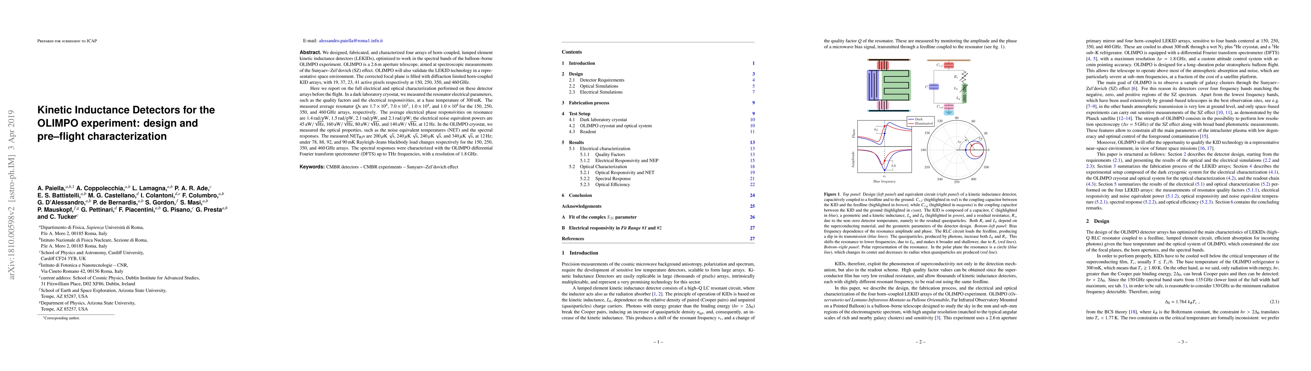 This paper details the design and pre-flight characterization of four arrays of horn-coupled kinetic inductance detectors (LEKIDs) for the OLIMPO experiment, which aims to measure the Sunyaev-Zel'dovich effect. The arrays exhibit high quality factors and low noise equivalent powers, with optical noise equivalent temperatures ranging from 200 to 340 μK√s at 12 Hz.