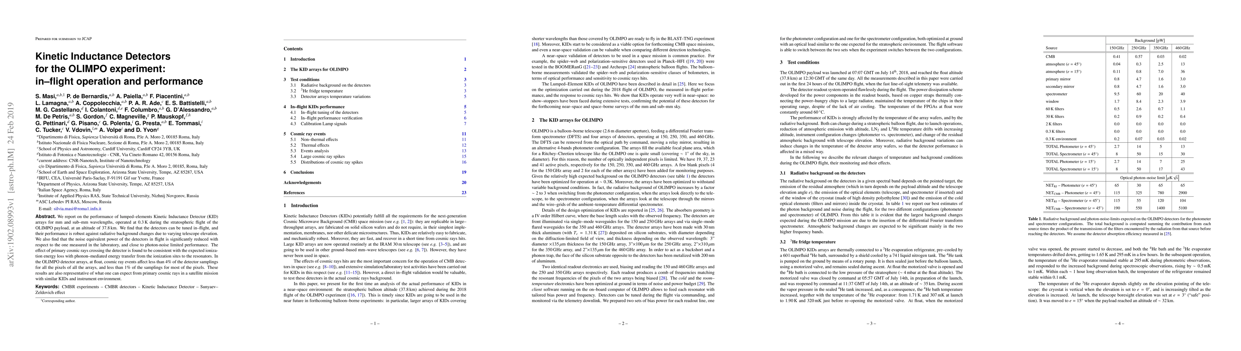 We report on the performance of lumped--elements Kinetic Inductance Detector (KID) arrays for mm and sub--mm wavelengths, operated at 0.3K during the stratospheric flight of the OLIMPO payload, at an altitude of 37.8 km. We find that the detectors can be tuned in-flight, and their performance is robust against radiative background changes due to varying telescope elevation. We also find that the noise equivalent power of the detectors in flight is significantly reduced with respect to the one measured in the laboratory, and close to photon-noise limited performance. The effect of primary cosmic rays crossing the detector is found to be consistent with the expected ionization energy loss with phonon-mediated energy transfer from the ionization sites to the resonators. In the OLIMPO detector arrays, at float, cosmic ray events affect less than 4% of the detector samplings for all the pixels of all the arrays, and less than 1% of the samplings for most of the pixels. These results are also representative of what one can expect from primary cosmic rays in a satellite mission with similar KIDs and instrument environment.