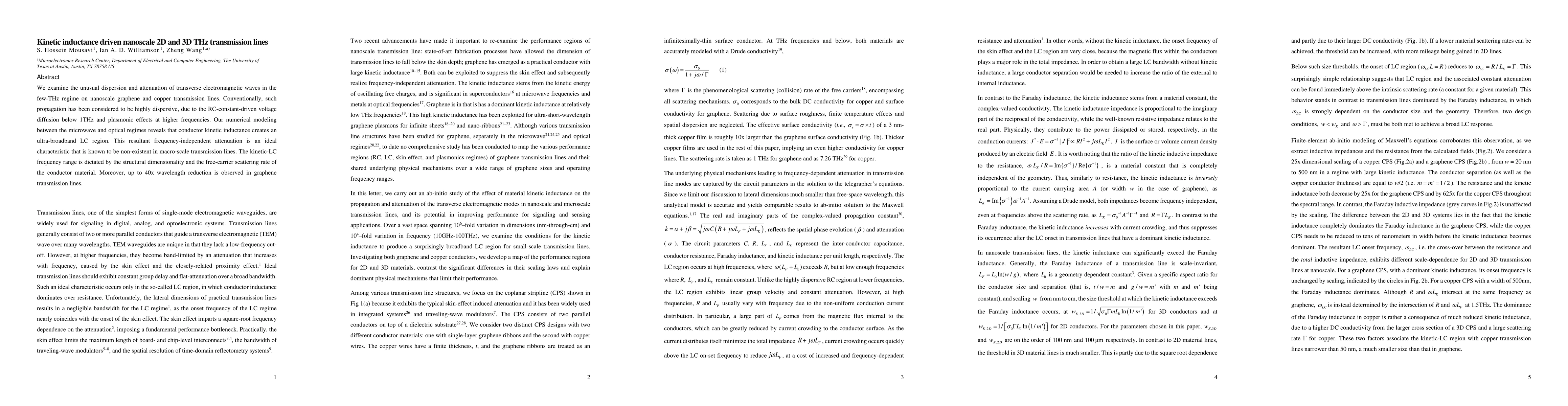 We examine the unusual dispersion and attenuation of transverse electromagnetic waves in the few-THz regime on nanoscale graphene and copper transmission lines. Conventionally, such propagation has been considered to be highly dispersive, due to the RC-constant-driven voltage diffusion below 1THz and plasmonic effects at higher frequencies. Our numerical modelling between the microwave and optical regimes reveals that conductor kinetic inductance creates an ultra-broadband LC region. This resultant frequency-independent attenuation is an ideal characteristic that is known to be non-existent in macro-scale transmission lines. The kinetic-LC frequency range is dictated by the structural dimensionality and the free-carrier scattering rate of the conductor material. Moreover, up to 40x wavelength reduction is observed in graphene transmission lines.