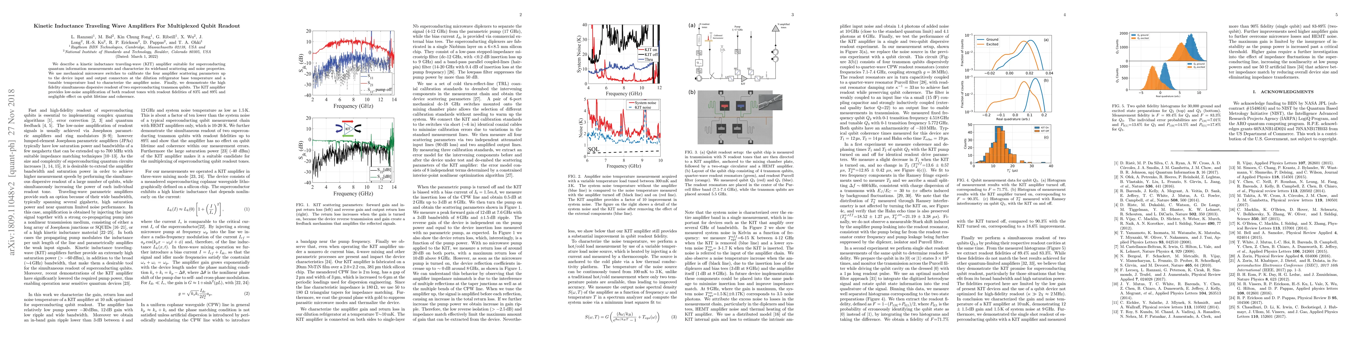 We describe a kinetic inductance traveling-wave (KIT) amplifier suitable for superconducting quantum information measurements and characterize its wideband scattering and noise properties. We use mechanical microwave switches to calibrate the four amplifier scattering parameters up to the device input and output connectors at the dilution refrigerator base temperature and a tunable temperature load to characterize the amplifier noise. Finally, we demonstrate the high fidelity simultaneous dispersive readout of two superconducting transmon qubits. The KIT amplifier provides low-noise amplification of both readout tones with readout fidelities of 83% and 89% and negligible effect on qubit lifetime and coherence.