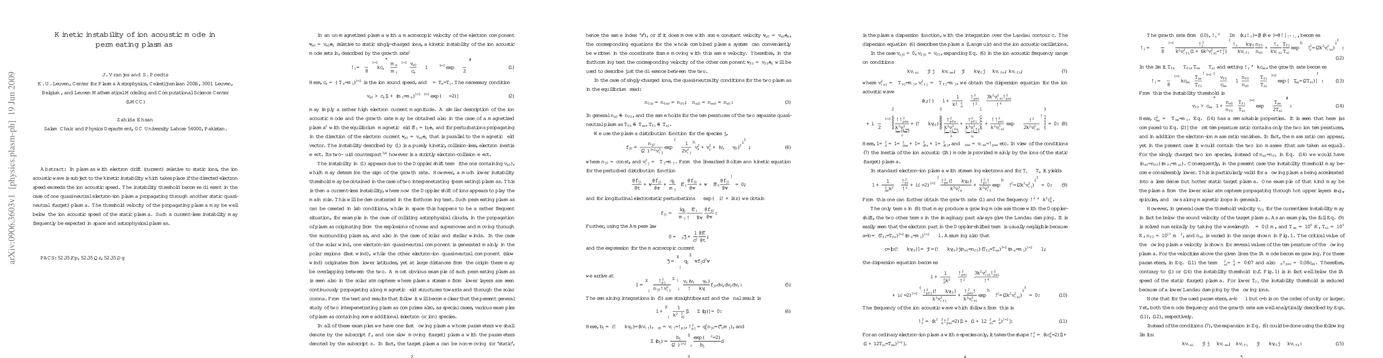 This paper investigates the kinetic instability of ion acoustic waves in permeating plasmas where electron drift causes instability if the electron speed exceeds the ion acoustic speed. The study finds that the instability threshold can be significantly lower than the ion acoustic speed of the static plasma, suggesting frequent occurrence in space and astrophysical plasmas.