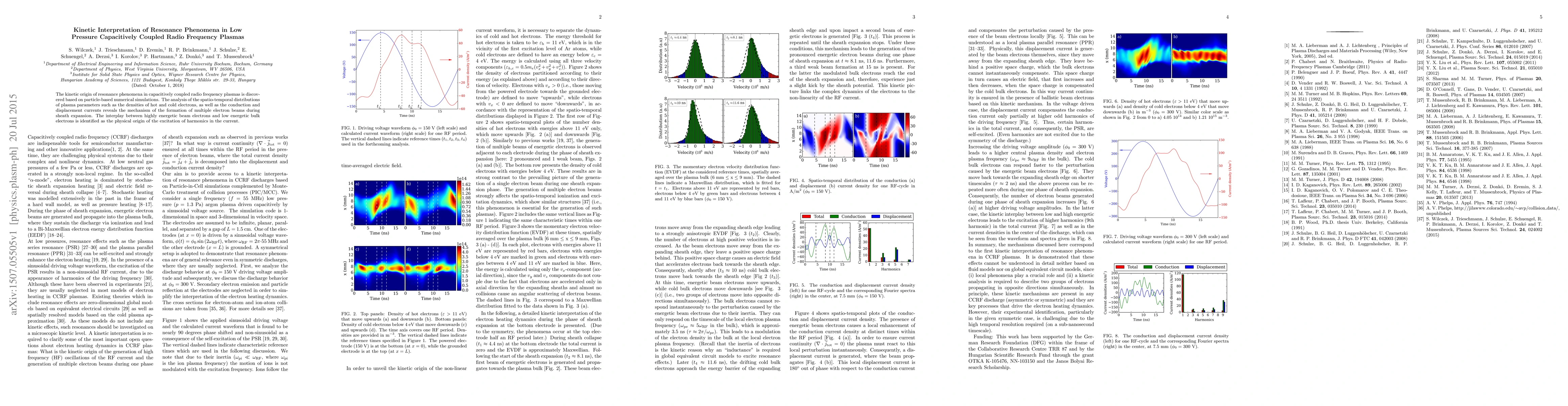 This paper uncovers the kinetic origins of resonance phenomena in low-pressure capacitively coupled radio frequency plasmas through particle-based simulations. The study reveals that the interaction between energetic beam electrons and low-energy bulk electrons generates harmonics in the current, highlighting the formation of multiple electron beams during sheath expansion.