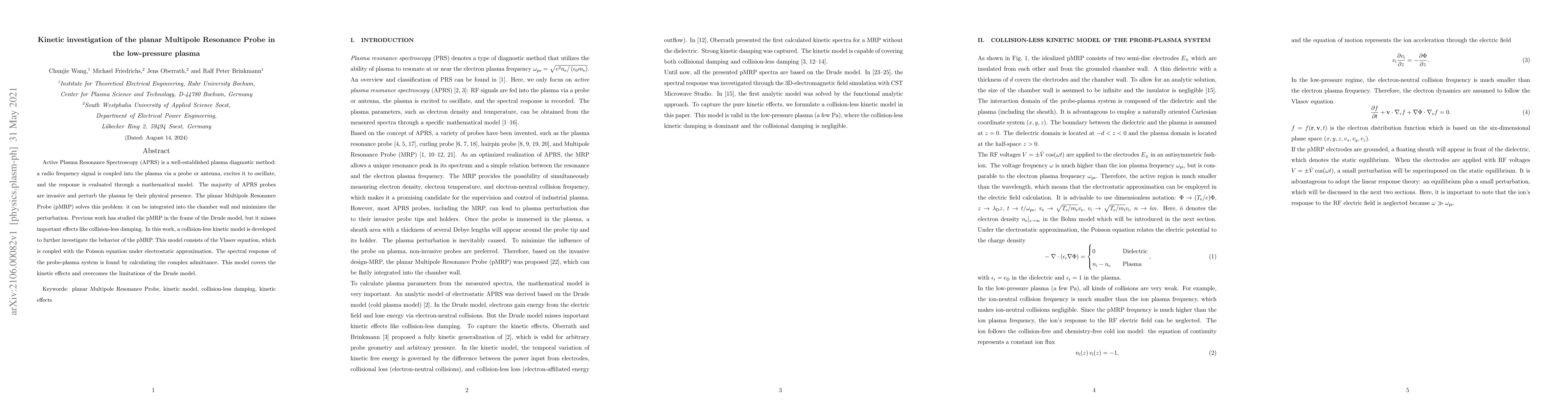 Researchers developed a new collision-less kinetic model to investigate the planar Multipole Resonance Probe in low-pressure plasma, overcoming limitations of existing models and providing a more accurate understanding of the probe-plasma interaction.