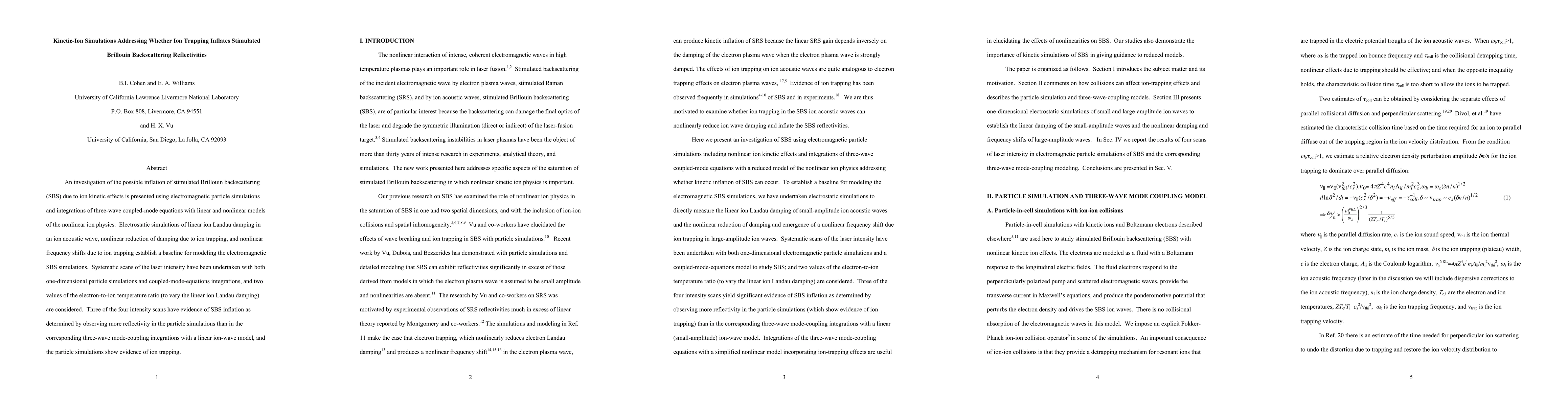 An investigation of the possible inflation of stimulated Brillouin backscattering (SBS) due to ion kinetic effects is presented using electromagnetic particle simulations and integrations of three-wave coupled-mode equations with linear and nonlinear models of the nonlinear ion physics. Electrostatic simulations of linear ion Landau damping in an ion acoustic wave, nonlinear reduction of damping due to ion trapping, and nonlinear frequency shifts due to ion trapping establish a baseline for modeling the electromagnetic SBS simulations. Systematic scans of the laser intensity have been undertaken with both one-dimensional particle simulations and coupled-mode-equations integrations, and two values of the electron-to-ion temperature ratio (to vary the linear ion Landau damping) are considered. Three of the four intensity scans have evidence of SBS inflation as determined by observing more reflectivity in the particle simulations than in the corresponding three-wave mode-coupling integrations with a linear ion-wave model, and the particle simulations show evidence of ion trapping.