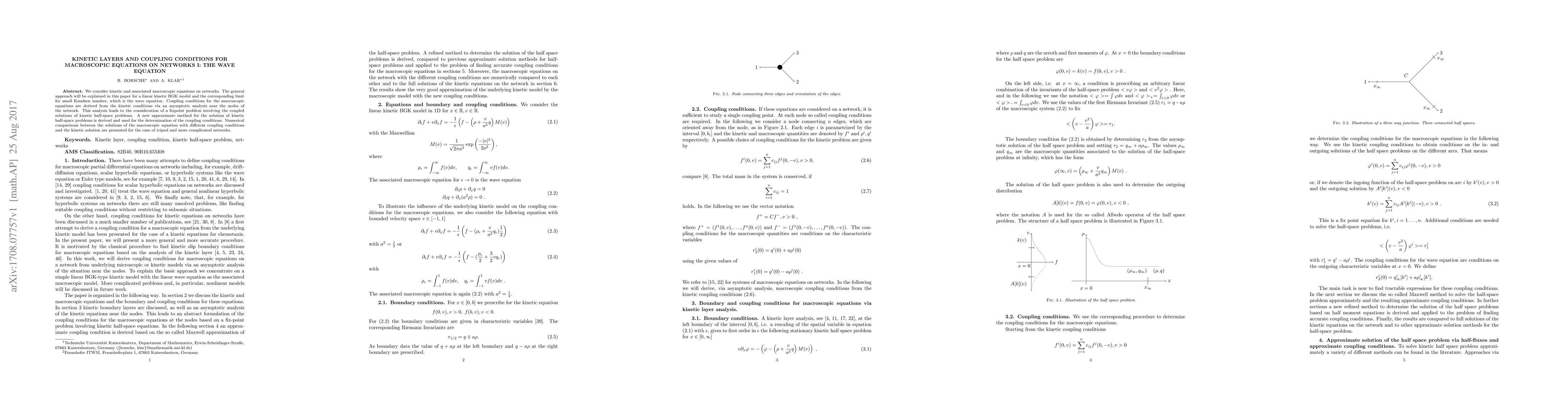 We consider kinetic and associated macroscopic equations on networks. The general approach will be explained in this paper for a linear kinetic BGK model and the corresponding limit for small Knudsen number, which is the wave equation. Coupling conditions for the macroscopic equations are derived from the kinetic conditions via an asymptotic analysis near the nodes of the network. This analysis leads to the consideration of a fixpoint problem involving the coupled solutions of kinetic half-space problems. A new approximate method for the solution of kinetic half-space problems is derived and used for the determination of the coupling conditions. Numerical comparisons between the solutions of the macroscopic equation with different coupling conditions and the kinetic solution are presented for the case of tripod and more complicated networks.