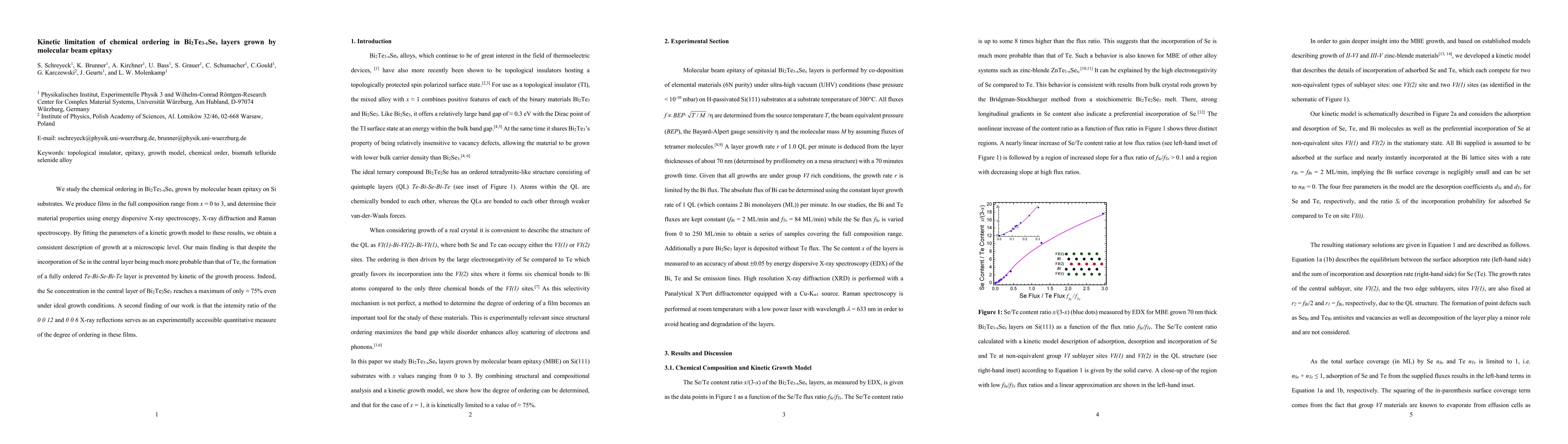 We study the chemical ordering in Bi$_2$Te$_{3-x}$Se$_x$ grown by molecular beam epitaxy on Si substrates. We produce films in the full composition range from x = 0 to 3, and determine their material properties using energy dispersive X-ray spectroscopy, X-ray diffraction and Raman spectroscopy. By fitting the parameters of a kinetic growth model to these results, we obtain a consistent description of growth at a microscopic level. Our main finding is that despite the incorporation of Se in the central layer being much more probable than that of Te, the formation of a fully ordered Te-Bi-Se-Bi-Te layer is prevented by kinetic of the growth process. Indeed, the Se concentration in the central layer of Bi$_2$Te$_2$Se$_1$ reaches a maximum of only $\approx$ 75% even under ideal growth conditions. A second finding of our work is that the intensity ratio of the 0 0 12 and 0 0 6 X-ray reflections serves as an experimentally accessible quantitative measure of the degree of ordering in these films.
