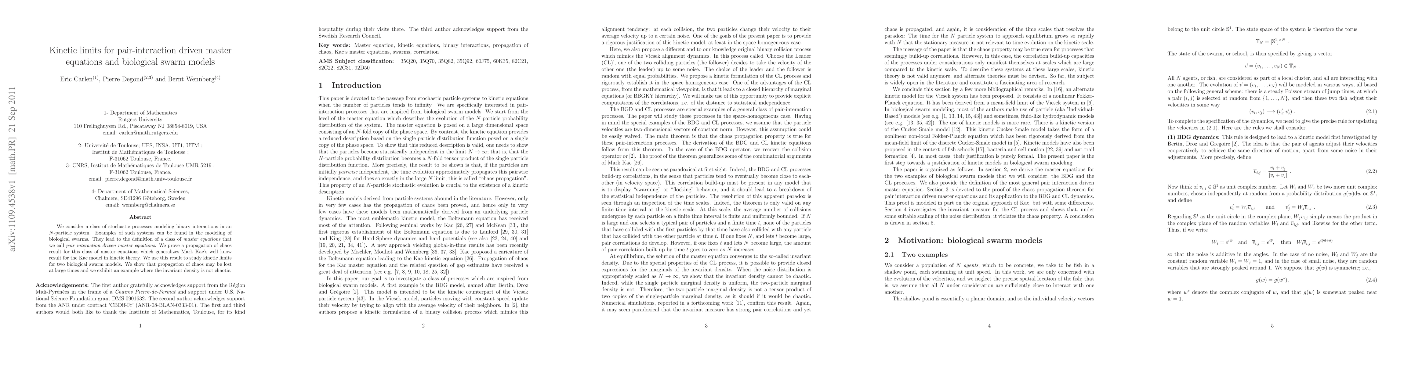This paper investigates stochastic processes modeling binary interactions in N-particle systems, particularly in biological swarms, leading to a class of pair interaction driven master equations. It proves a generalized propagation of chaos result and applies it to study kinetic limits in two biological swarm models, revealing instances where chaos propagation may fail over time and the invariant density is non-chaotic.