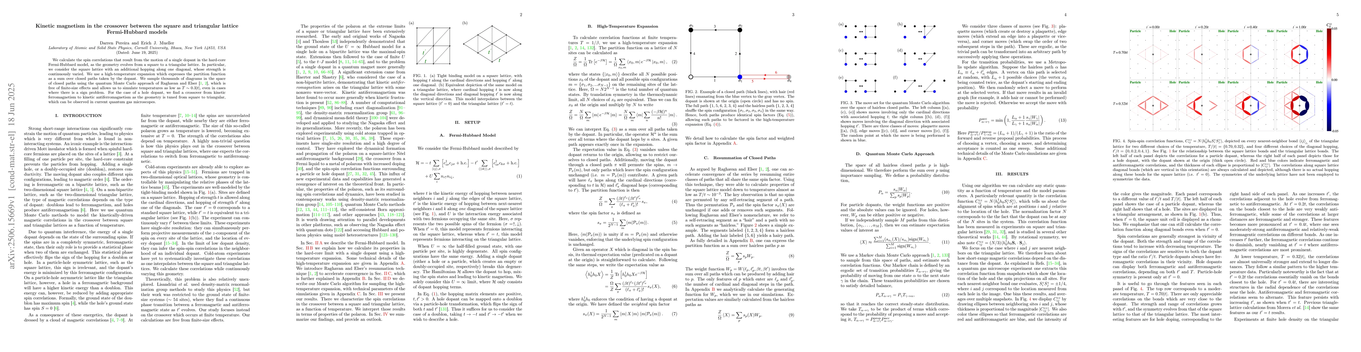 We calculate the spin correlations that result from the motion of a single dopant in the hard-core Fermi-Hubbard model, as the geometry evolves from a square to a triangular lattice. In particular, we consider the square lattice with an additional hopping along one diagonal, whose strength is continuously varied. We use a high-temperature expansion which expresses the partition function as a sum over closed paths taken by the dopant. We sample thousands of diagrams in the space of closed paths using the quantum Monte Carlo approach of Raghavan and Elser [1,2], which is free of finite-size effects and allows us to simulate temperatures as low as $T \sim 0.3|t|$, even in cases where there is a sign problem. For the case of a hole dopant, we find a crossover from kinetic ferromagnetism to kinetic antiferromagnetism as the geometry is tuned from square to triangular, which can be observed in current quantum gas microscopes.