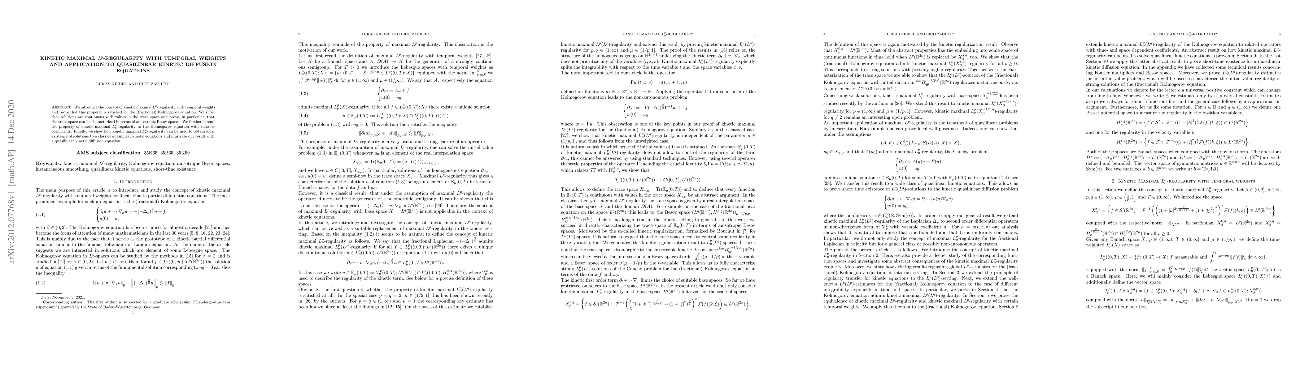 This paper introduces kinetic maximal $L^p$-regularity with temporal weights and demonstrates its applicability to the fractional Kolmogorov equation, proving continuity in trace space and characterizing it via anisotropic Besov spaces. It extends these results to variable coefficient cases and uses the concept to establish local existence for quasilinear kinetic diffusion equations.