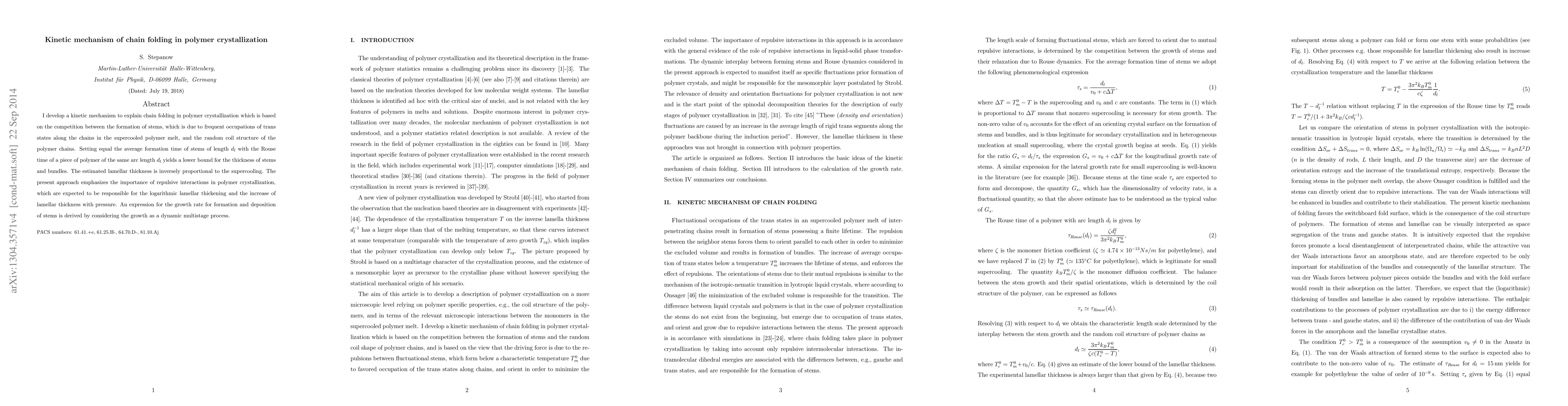 This paper proposes a kinetic mechanism explaining chain folding in polymer crystallization, emphasizing the competition between stem formation and random coil structures. It derives a lower bound for stem thickness based on polymer dynamics, showing that lamellar thickness inversely correlates with supercooling, and highlights the role of repulsive interactions in polymer crystallization.