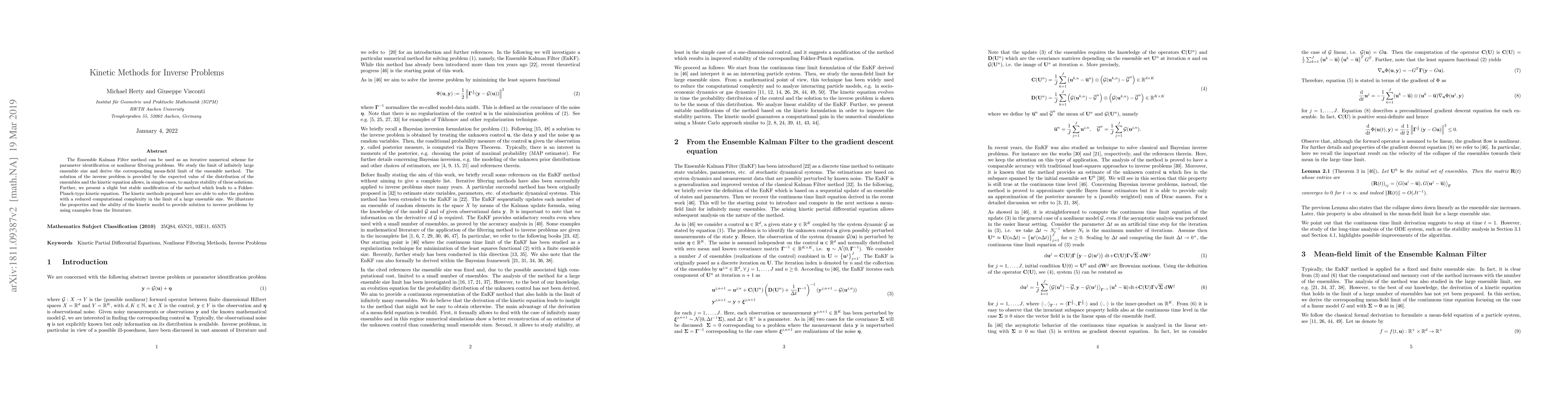 The paper introduces a new method for solving inverse problems using kinetic methods, which can solve complex nonlinear problems with reduced computational complexity, especially in large ensemble sizes.