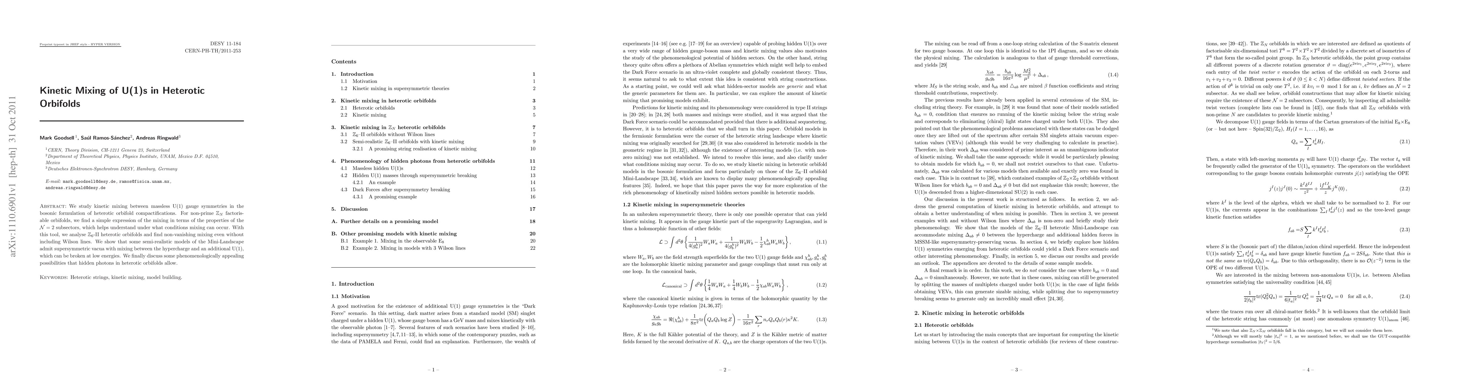 This paper explores kinetic mixing between massless U(1) gauge symmetries in heterotic orbifold compactifications, revealing conditions under which mixing occurs. It demonstrates non-vanishing mixing in Z_6-II heterotic orbifolds without Wilson lines and suggests that some semi-realistic models may allow for mixing between hypercharge and additional U(1) symmetries, potentially broken at low energies.