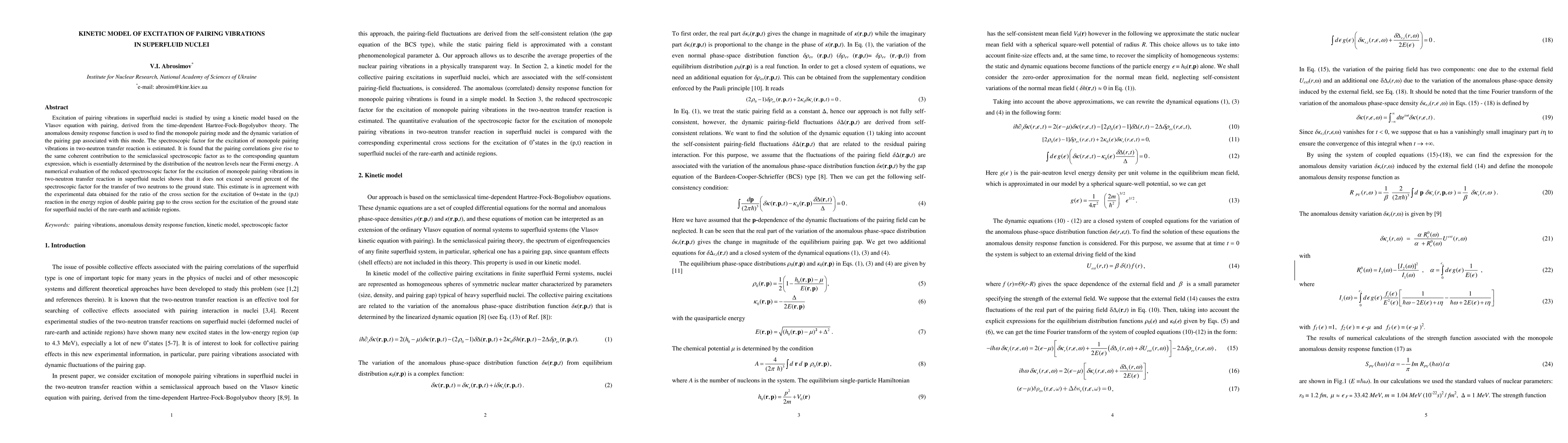 This paper develops a kinetic model based on the Vlasov equation with pairing to study excitation of pairing vibrations in superfluid nuclei, finding that pairing correlations contribute coherently to spectroscopic factors. Numerical results show that the reduced spectroscopic factor for monopole pairing vibrations in two-neutron transfer reactions is small, consistent with experimental data for rare-earth and actinide nuclei.