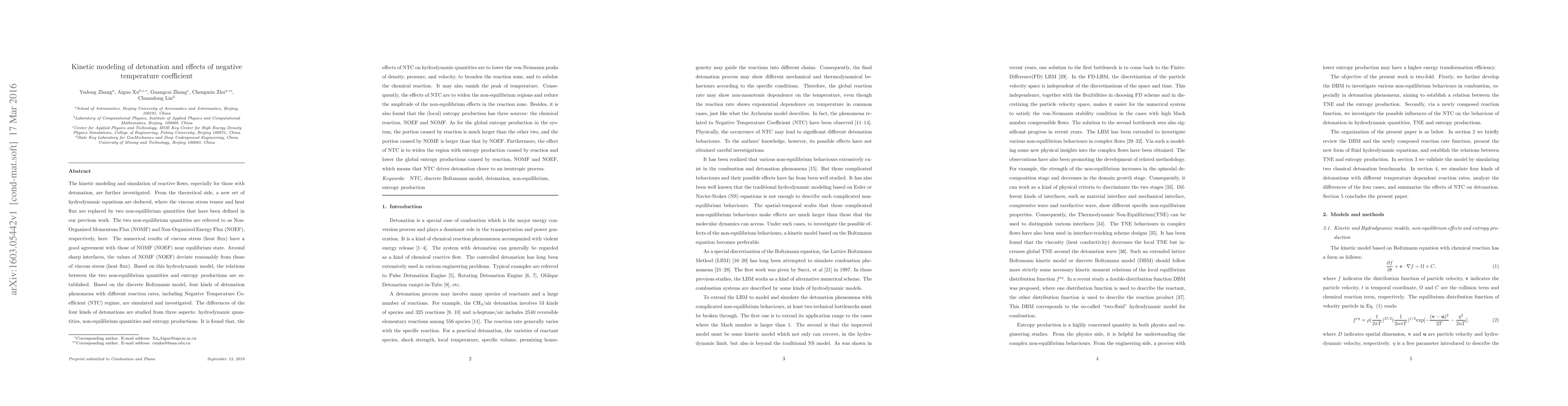 This paper develops a new kinetic model for detonation using NonOrganized Momentum Flux (NOMF) and Non-Organized Energy Flux (NOEF) to replace viscous stress and heat flux, respectively. The study investigates four detonation phenomena, including the Negative Temperature Coefficient (NTC) regime, and compares their hydrodynamic, non-equilibrium, and entropy production characteristics.
