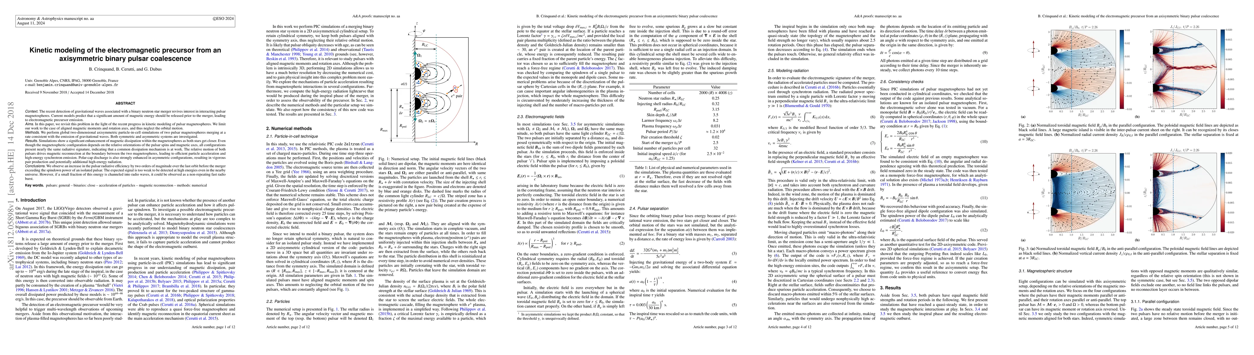 The recent detection of gravitational waves associated with a binary neutron star merger revives interest in interacting pulsar magnetospheres. Current models predict that a significant amount of magnetic energy should be released prior to the merger, leading to electromagnetic precursor emission. In this paper, we revisit this problem in the light of the recent progress in kinetic modeling of pulsar magnetospheres. We limit our work to the case of aligned magnetic moments and rotation axes, and thus neglect the orbital motion. We perform global two-dimensional axisymmetric particle-in-cell simulations of two pulsar magnetospheres merging at a rate consistent with the emission of gravitational waves. Both symmetric and asymmetric systems are investigated. Simulations show a significant enhancement of magnetic dissipation within the magnetospheres as both stars get closer. Even though the magnetospheric configuration depends on the relative orientations of the pulsar spins and magnetic axes, all configurations present nearly the same radiative signature, indicating that a common dissipation mechanism is at work. The relative motion of both pulsars drives magnetic reconnection at the boundary between the two magnetospheres, leading to efficient particle acceleration and high-energy synchrotron emission. Polar-cap discharge is also strongly enhanced in asymmetric configurations, resulting in vigorous pair production and potentially additional high-energy radiation. We observe an increase in the pulsar radiative efficiency by two orders of magnitude over the last orbit before the merger exceeding the spindown power of an isolated pulsar. The expected signal is too weak to be detected at high energies even in the nearby universe. However, if a small fraction of this energy is channeled into radio waves, it could be observed as a non-repeating fast radio burst.
