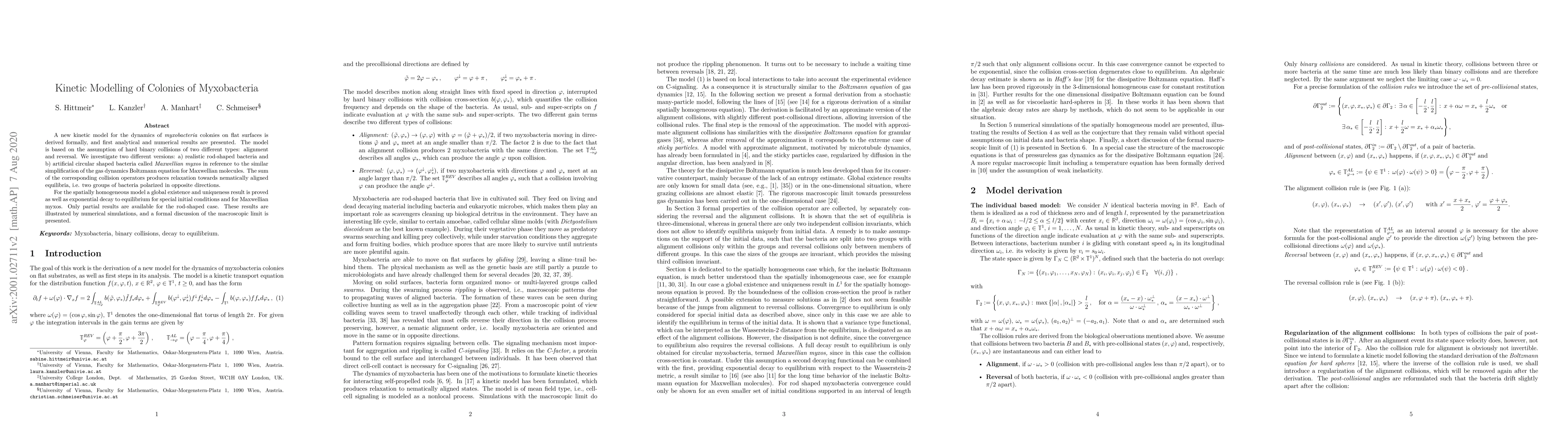 A new kinetic model describes how colonies of Myxobacteria bacteria interact on flat surfaces through collisions, showing exponential decay to equilibrium under certain conditions.