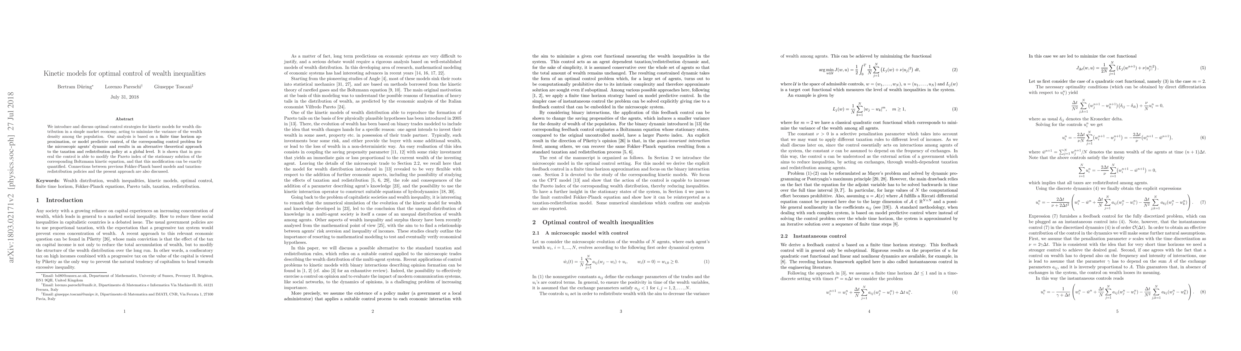 This paper proposes optimal control strategies for kinetic models to minimize wealth inequality variance in a market economy, using model predictive control. It demonstrates that these strategies can modify the Pareto index of the wealth distribution, offering a new theoretical approach to taxation and redistribution policies.