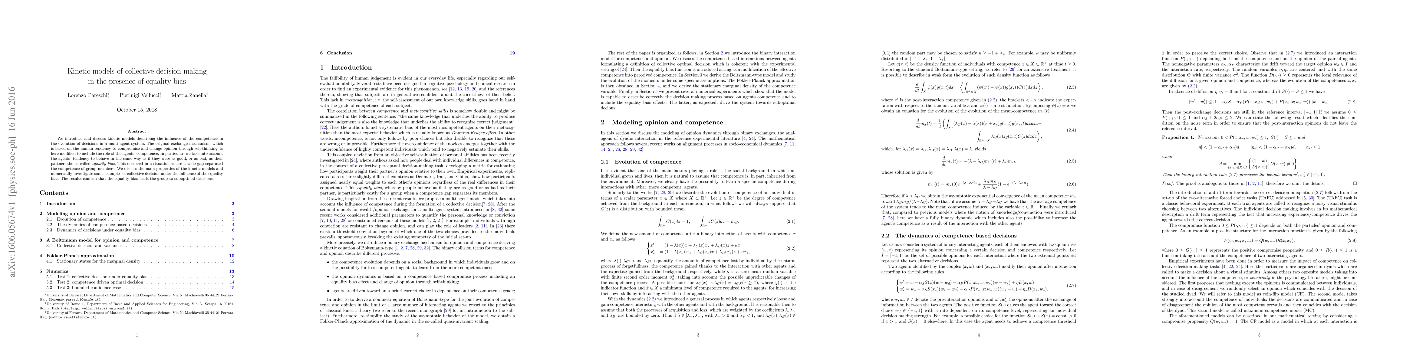 We introduce and discuss kinetic models describing the influence of the competence in the evolution of decisions in a multi-agent system. The original exchange mechanism, which is based on the human tendency to compromise and change opinion through self-thinking, is here modified to include the role of the agents' competence. In particular, we take into account the agents' tendency to behave in the same way as if they were as good, or as bad, as their partner: the so-called equality bias. This occurred in a situation where a wide gap separated the competence of group members. We discuss the main properties of the kinetic models and numerically investigate some examples of collective decision under the influence of the equality bias. The results confirm that the equality bias leads the group to suboptimal decisions.