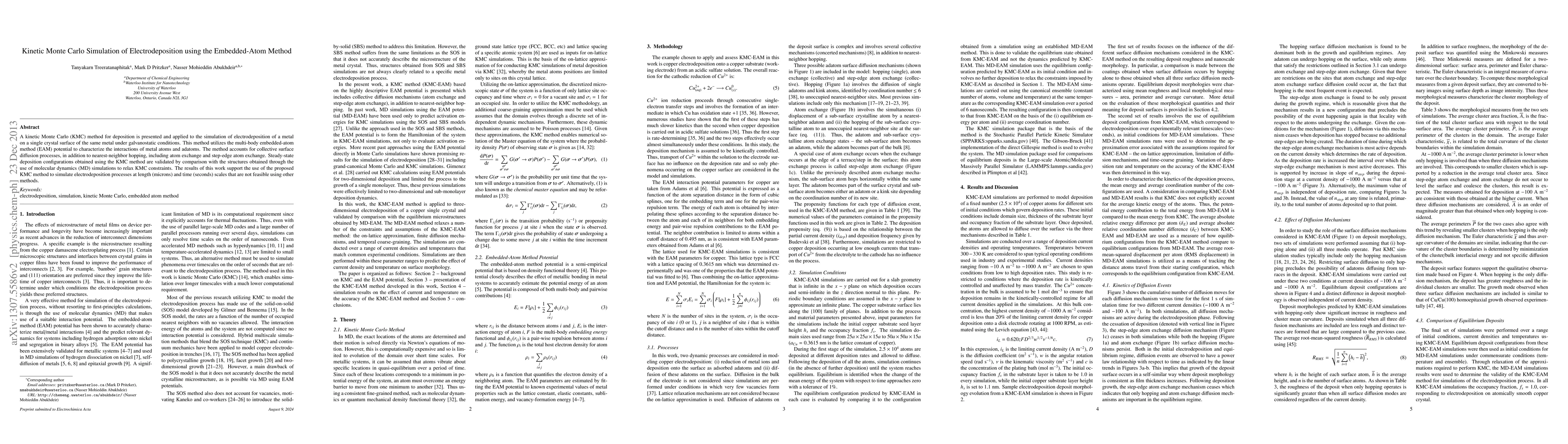 This paper presents a kinetic Monte Carlo (KMC) method for simulating electrodeposition of metal on a metal surface using the embedded-atom method (EAM) to model atomic interactions. The KMC method accurately captures deposition and surface diffusion processes, validated by comparison with molecular dynamics simulations.