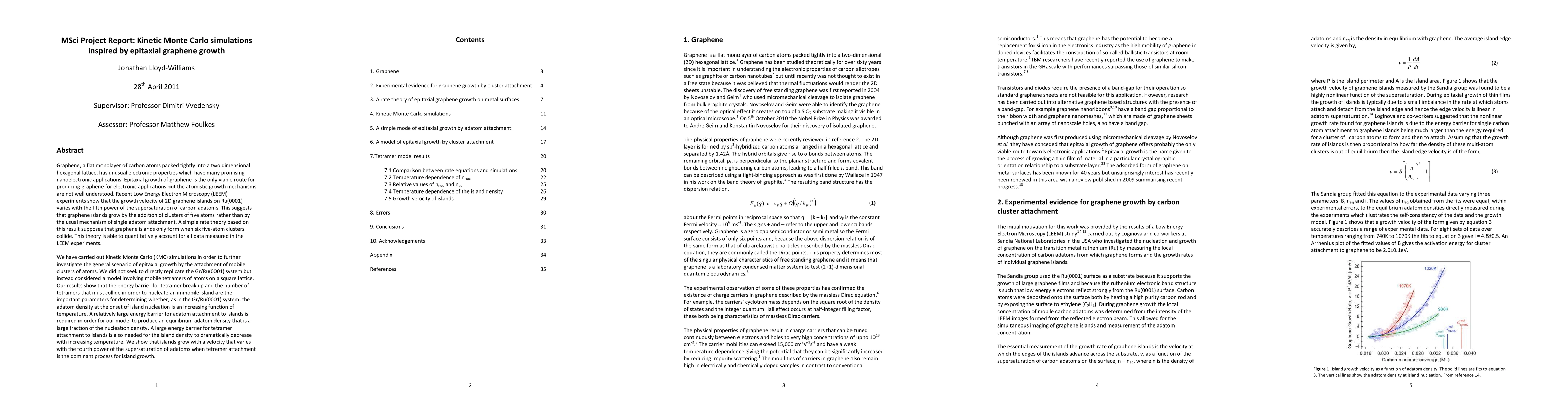 This paper uses Kinetic Monte Carlo simulations to explore the growth mechanism of epitaxial graphene, focusing on the addition of clusters of five atoms rather than single adatoms. The study finds that the energy barrier for tetramer break-up and the number of tetramers required for island nucleation are crucial factors in determining the growth dynamics, with the island growth velocity varying with the fourth power of adatom supersaturation.